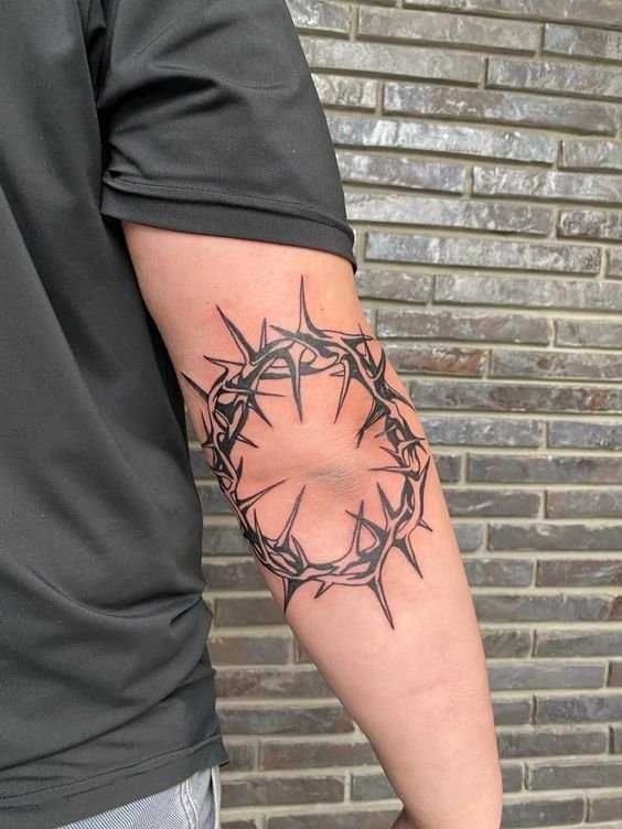 Этот участок идеально подходит для изображения сферических объектов (планеты, глаза, геометрические фигуры и т.д.) или композиций с соответствующей композицией (мандалы, паутина, символы Инь и Янь и другие). Мужские тату на локте обычно размещаются прямо на суставе, в месте, где он соединяется с верхней и нижней частями руки, однако, иногда используется и внутренняя частица локтя. Область вокруг локтевого сустава художники также не обходят стороной, чтобы задействовать максимум пространства.