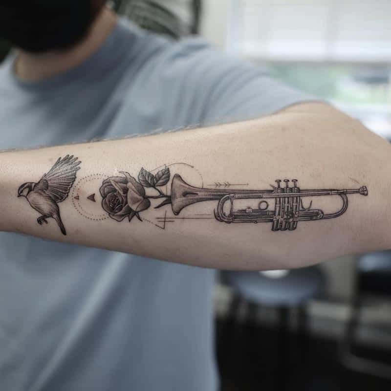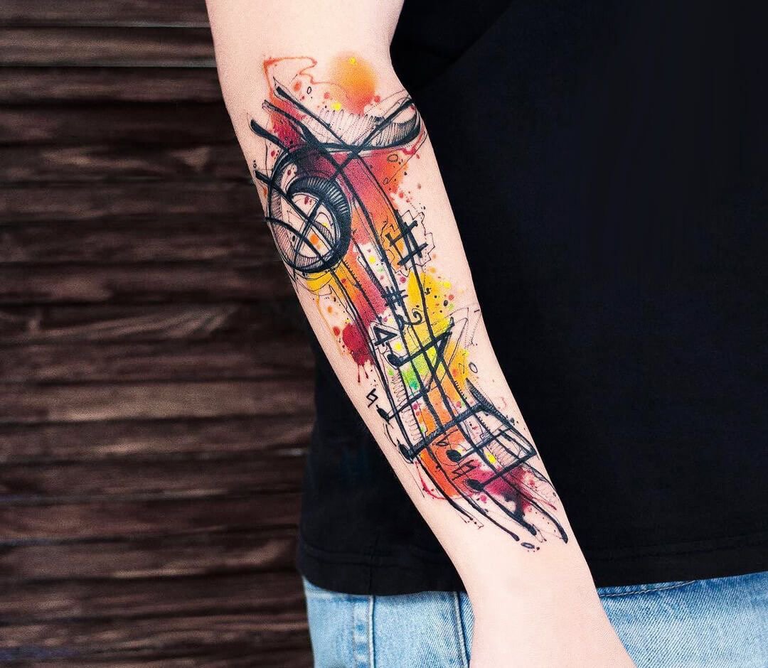 Музыкальные тату – модный тренд, который помогает показать любовь к музыке и проявить индивидуальность. Разнообразие вариантов дизайна позволяет сделать татуировку, которая полностью отражает замысел. Музыкальные тату гармонично сочетаются с другими сюжетами, подходят для заполнения обширных композиций, например, рукава. Татуировки, посвященные музыке, эффектно выглядят в формате соло. Это выбор профессиональных музыкантов, лэутаров и простых слушателей.