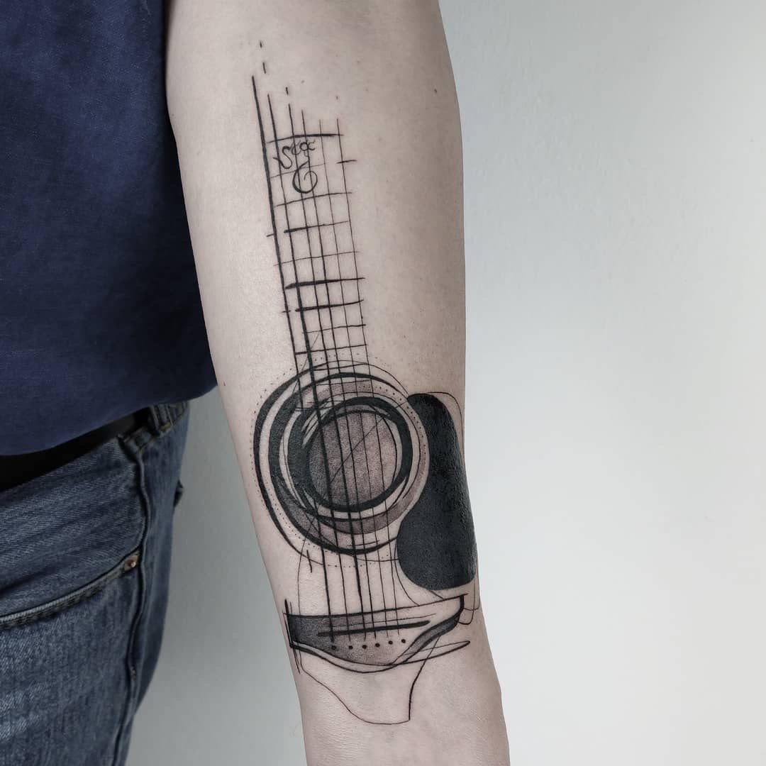 Гитара – знак любви к музыке. В зависимости от вида гитары можно угадать музыкальные пристрастия владельца. Акустическая гитара указывает на увлечение авторской песней, электрогитара означает симпатию к композициям в стиле рок. Нательный рисунок в виде гитары также символизирует душевное равновесие и внутреннюю гармонию. Изображение акустической гитары часто выбирают романтичные натуры, которые склонны идеализировать чувства и отношения.