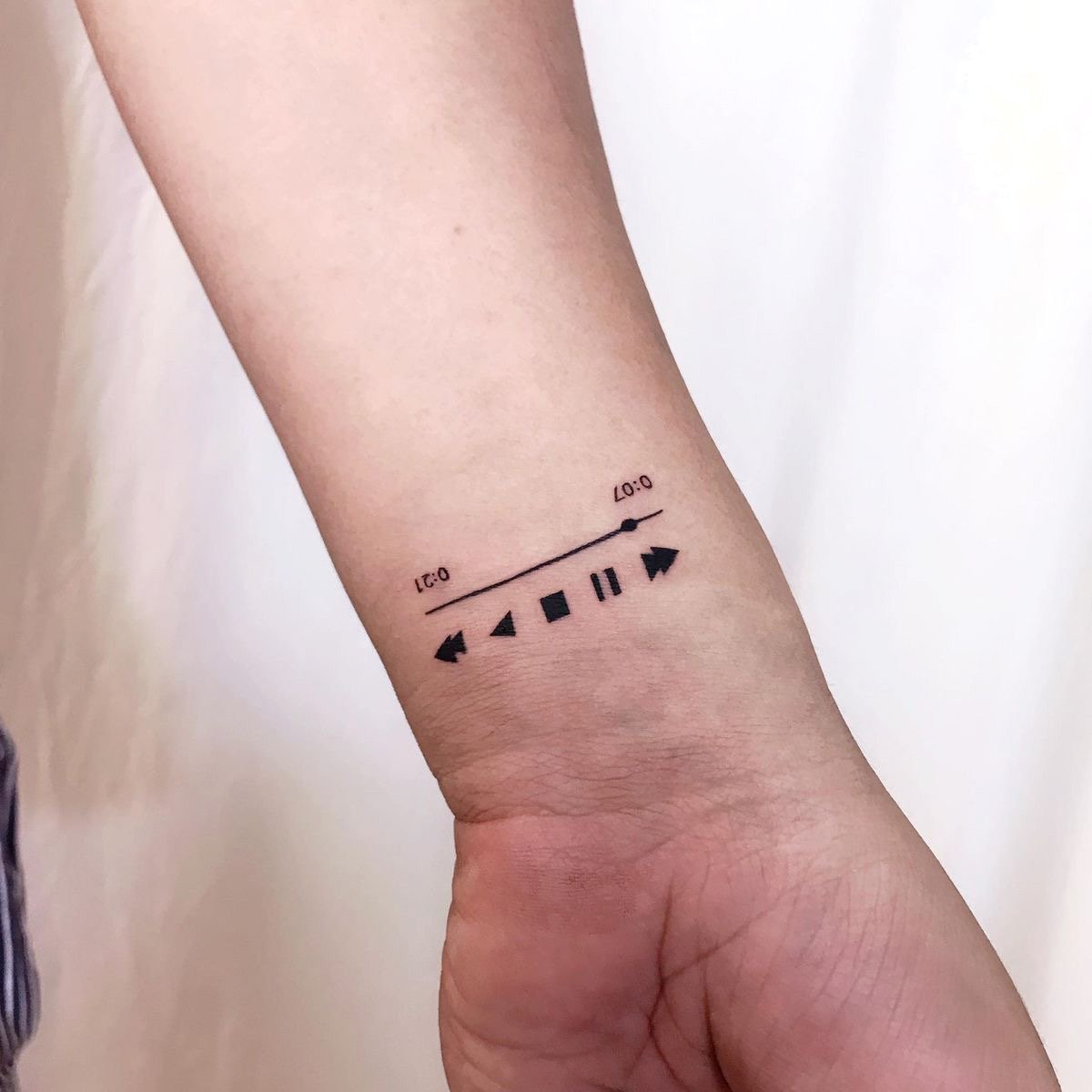 Нательный рисунок в виде кнопок воспроизведения музыки на смартфоне или бумбоксе означает самоконтроль и стремление к порядку. Изображение символизирует целостную, уверенную в себе личность, которая осознанно принимает решения и воплощает планы в реальность.