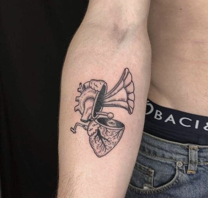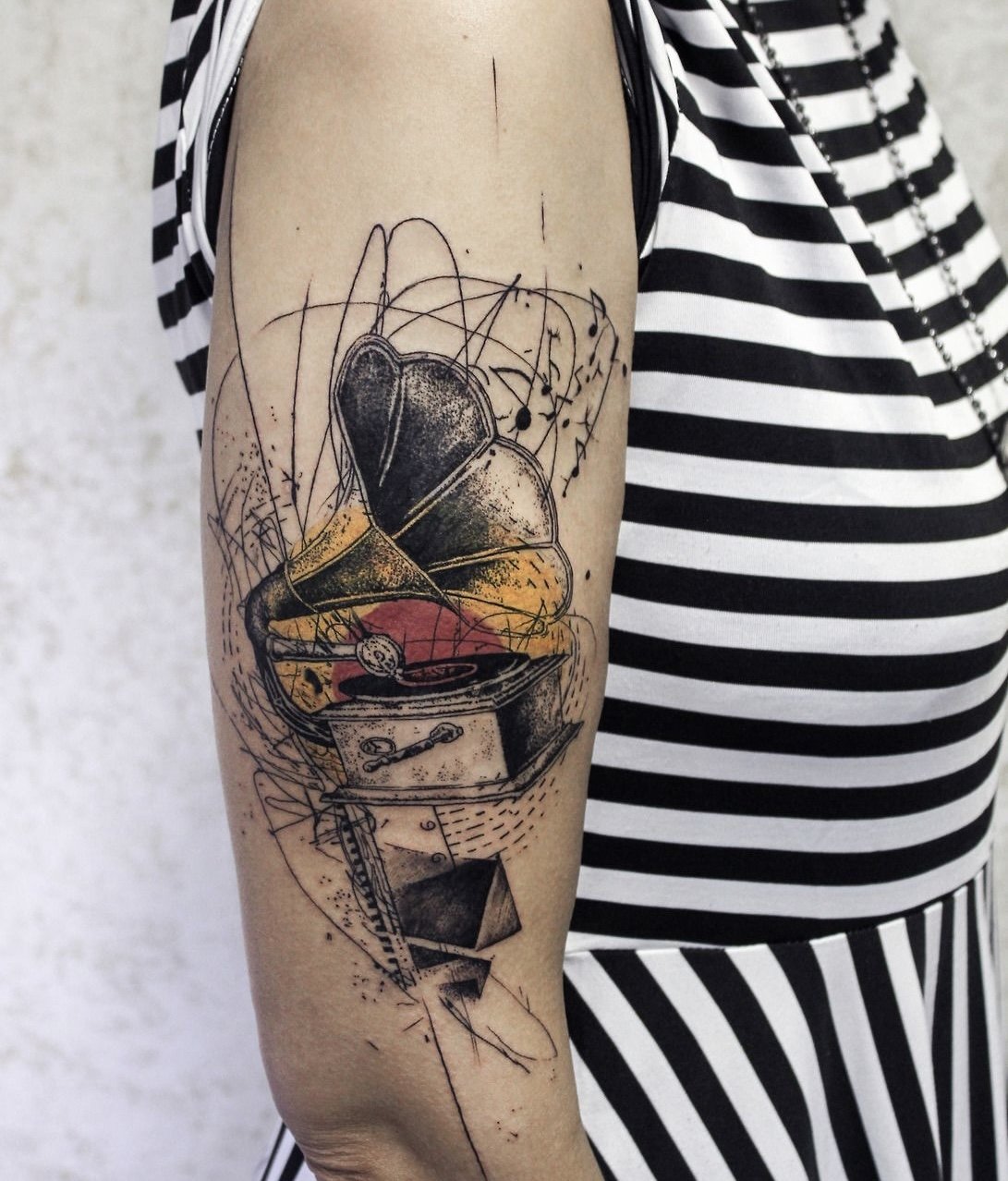 Татуировка граммофона указывает на человека, который привык каждый момент жизни сопровождать подходящей композицией.