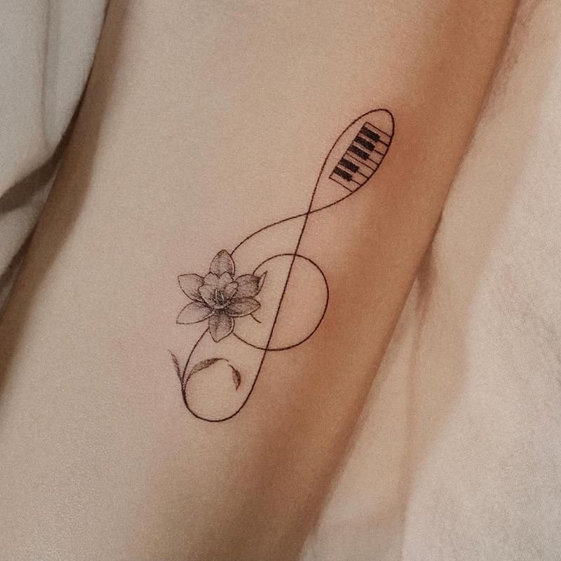 Музыка помогает сохранять хорошее настроение в любой ситуации и преодолевать препятствия на жизненном пути. Татуировка несет позитивный посыл и повышает устойчивость к стрессам. Нательные рисунки, связанные с музыкой, подходят для начинающих поклонников культуры тату. Сделайте небольшую татуировку, чтобы впоследствии продолжить, дополнив изображение новыми деталями и надписями.