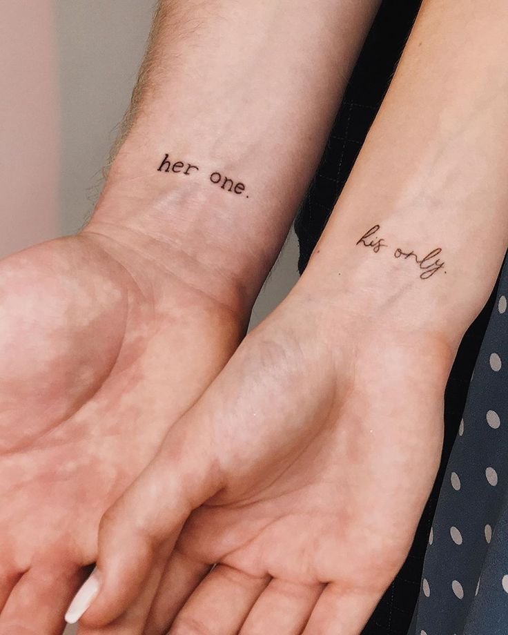 Важно: Мастера не рекомендуют делать татуировки имен возлюбленных или даты, так как жизнь непредсказуема и часто преподносит сюрпризы. Возможно, пару впереди ждет разлука, а татуировка останется неприятным воспоминанием о замужестве или женитьбе. Лучше при выборе эскиза остановить свой выбор на нейтральных рисунках, которые вместе несут собой глубокую символическую нагрузку, а по отдельности могут восприниматься как аккуратный, нейтральный рисунок.
