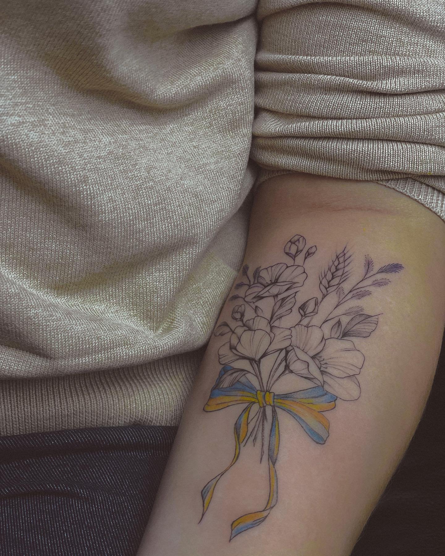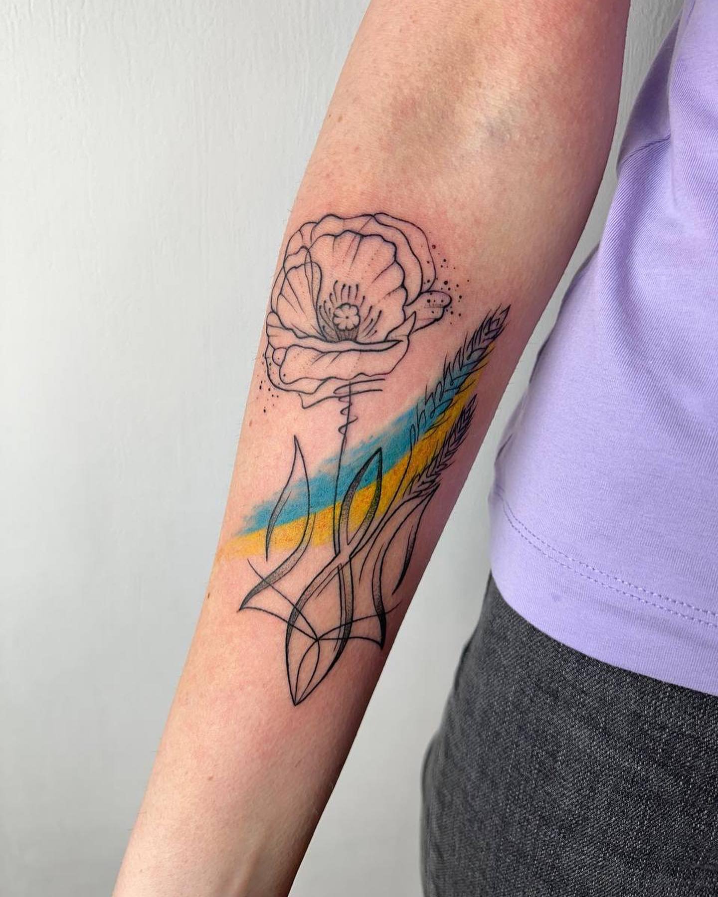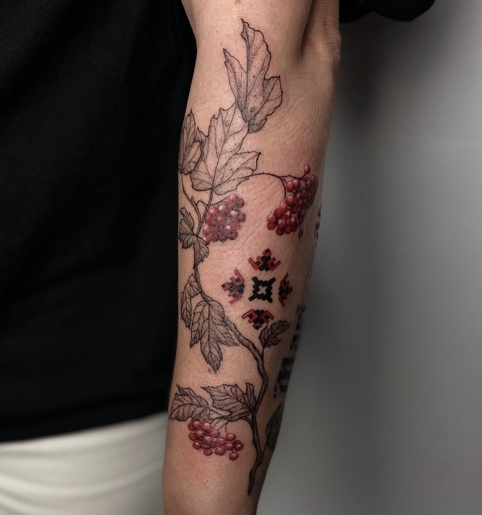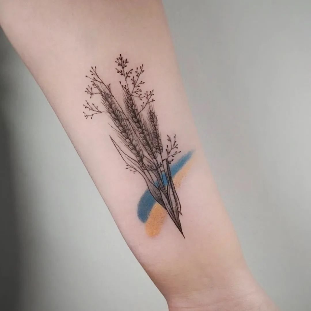 Женская патриотическая татуировка поражает своей органикой, все элементы взаимодействуют между собой, имеют общий мотив. И, если мужчины предпочитают татуировки лаконичные и несколько суровые, то украинские волшебницы выражают свою любовь к родине через нежность.