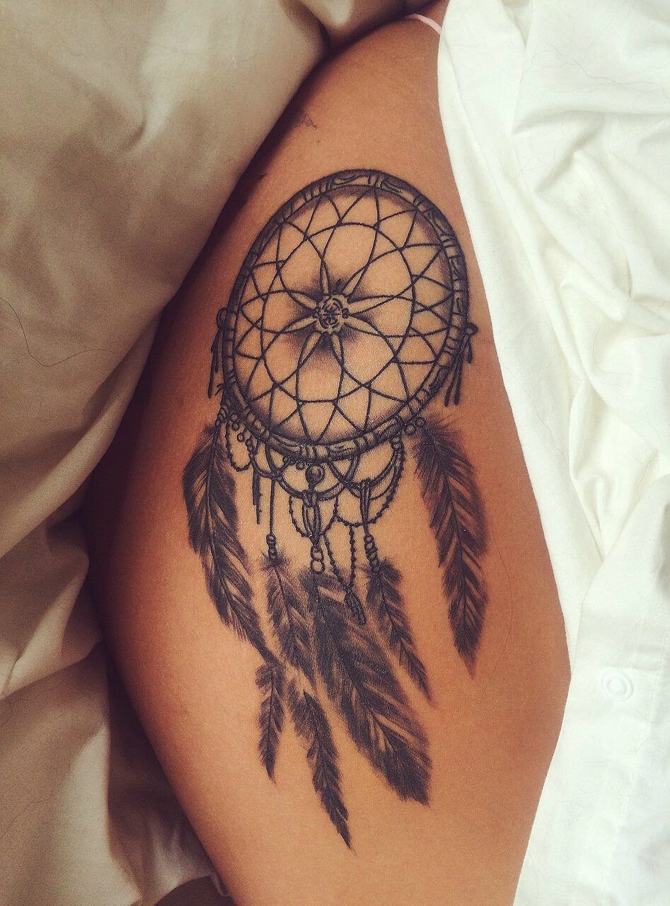 - Татуировка с мистическим ловцом снов олицетворяет безопасность и защищенность. Он напоминает форму луны с хрупкими и легкими перьями. Бедро позволяет свободно масштабировать эскиз, чтобы изобразить деликатные детали и мельчайшие элементы.