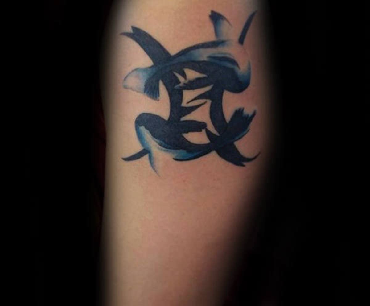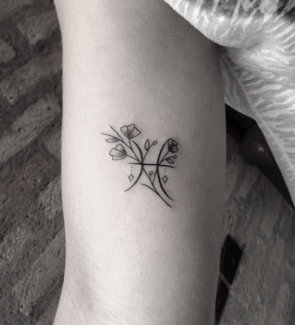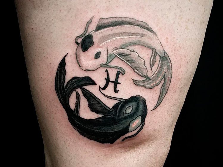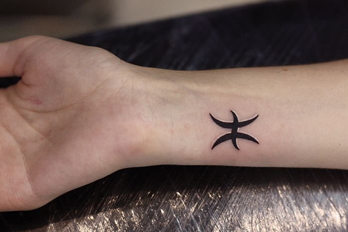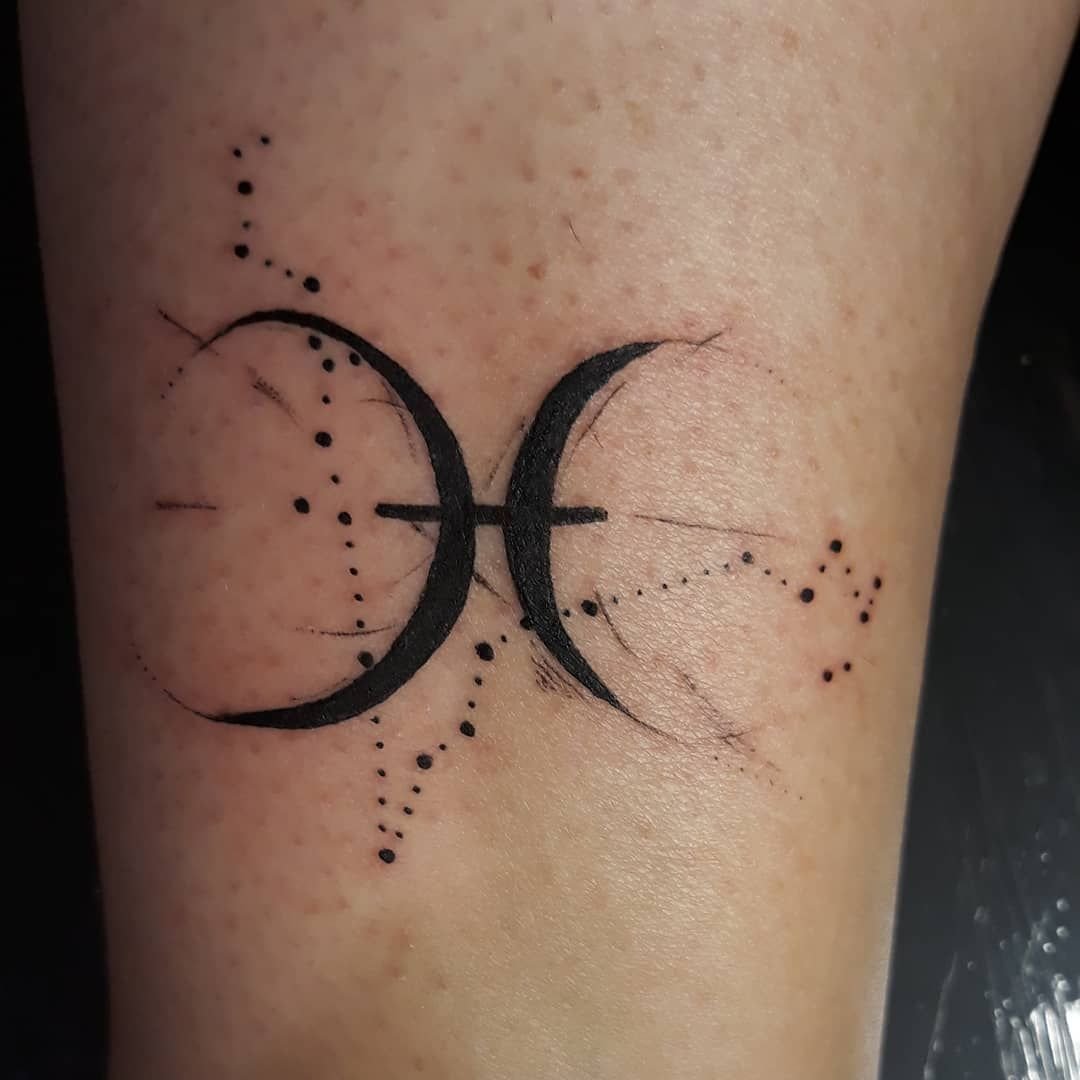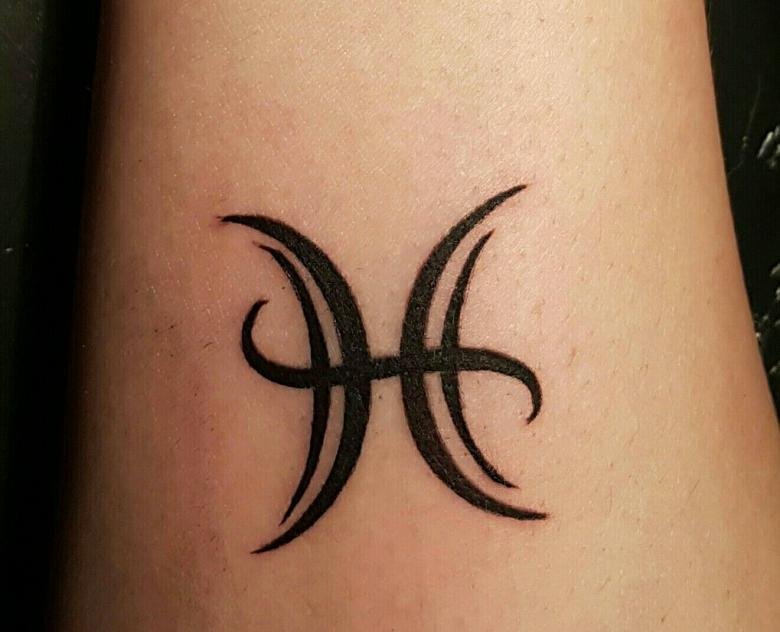 Традиционное тату для знака зодиака Рыбы выглядит как два полумесяца, повернутые друг к другу спиной и соединенные между собой горизонтальной полоской. Этот символ означает двух рыб, которые плывут в разном направлении, однако тесно связаны друг с другом.