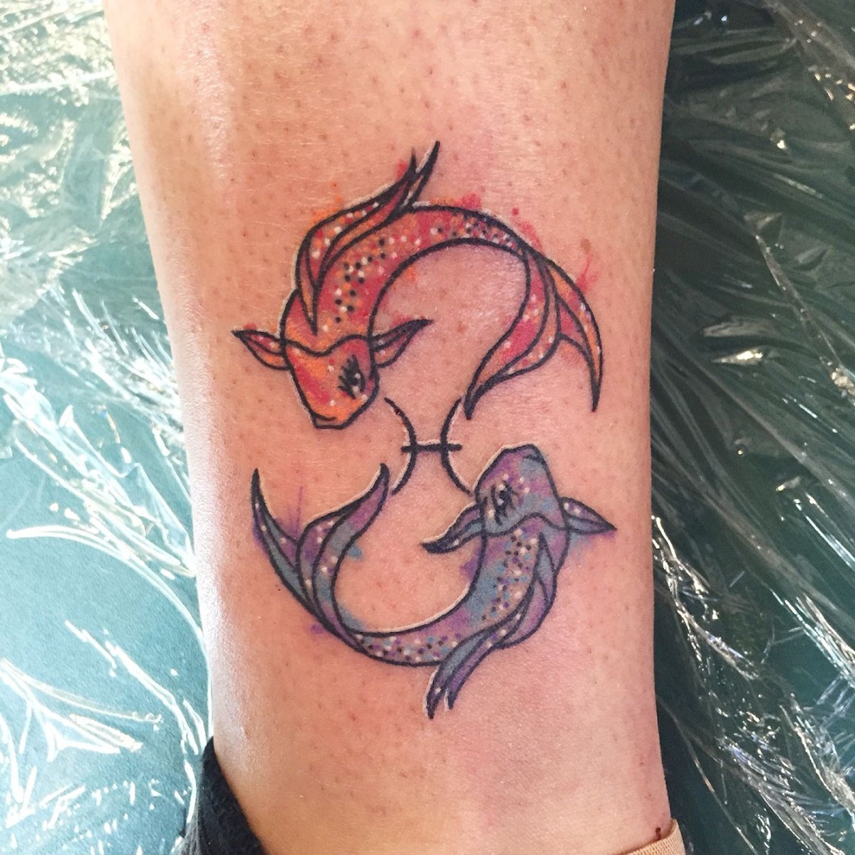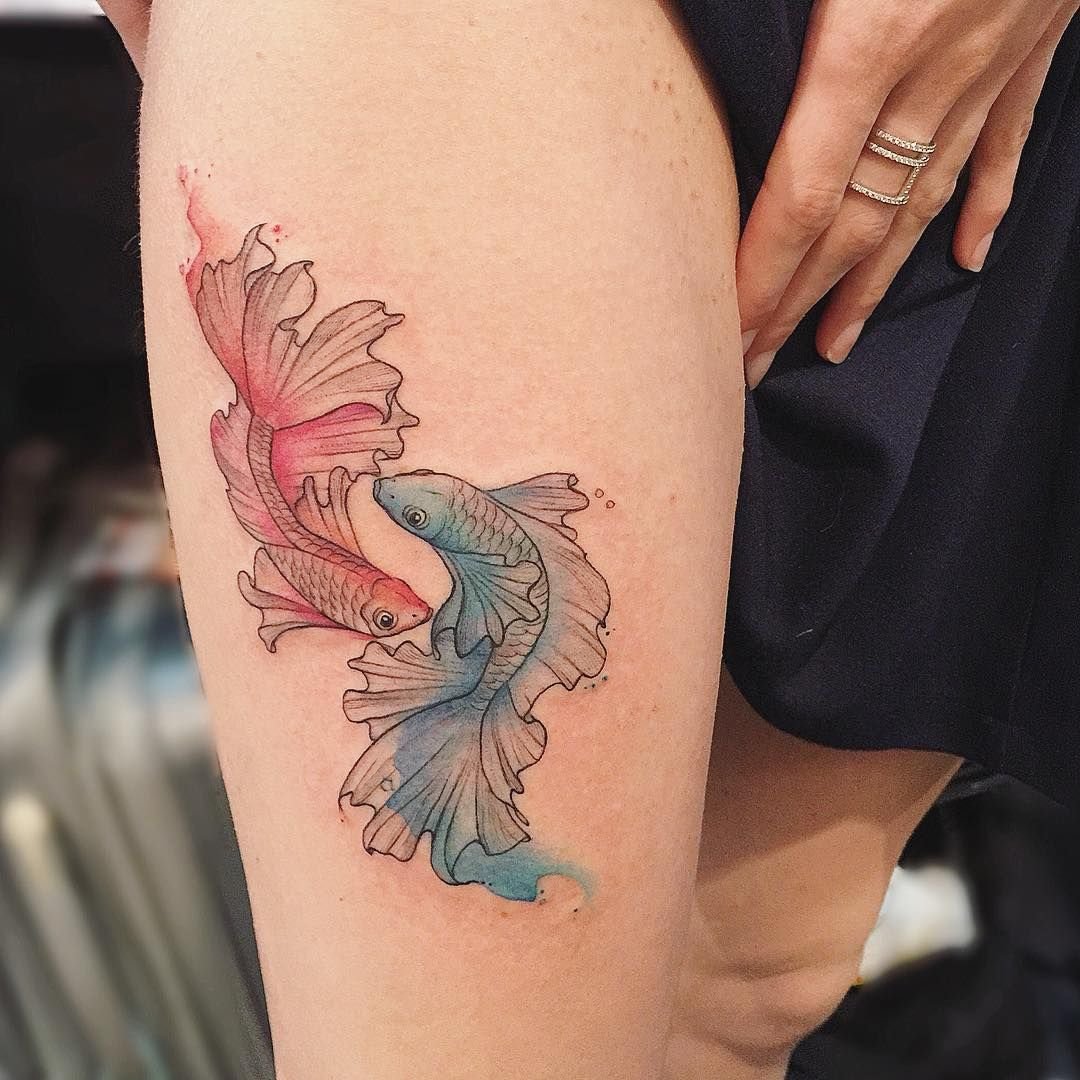 - Тату-мастера рекомендуют выбирать технику акварель для выполнения тату знак зодиака Рыбы. Эта техника позволяет создать эффект воздушности и невесомости. Особенно круто это смотрится на плавниках рыбы. Стиль акварели характеризуется использованием большого количества ярких оттенков и "вкраплений краски". Поэтому эта техника позволяет экспериментировать с цветами и формами. Кроме этого, вы можете совместить акварель с другими стилями.