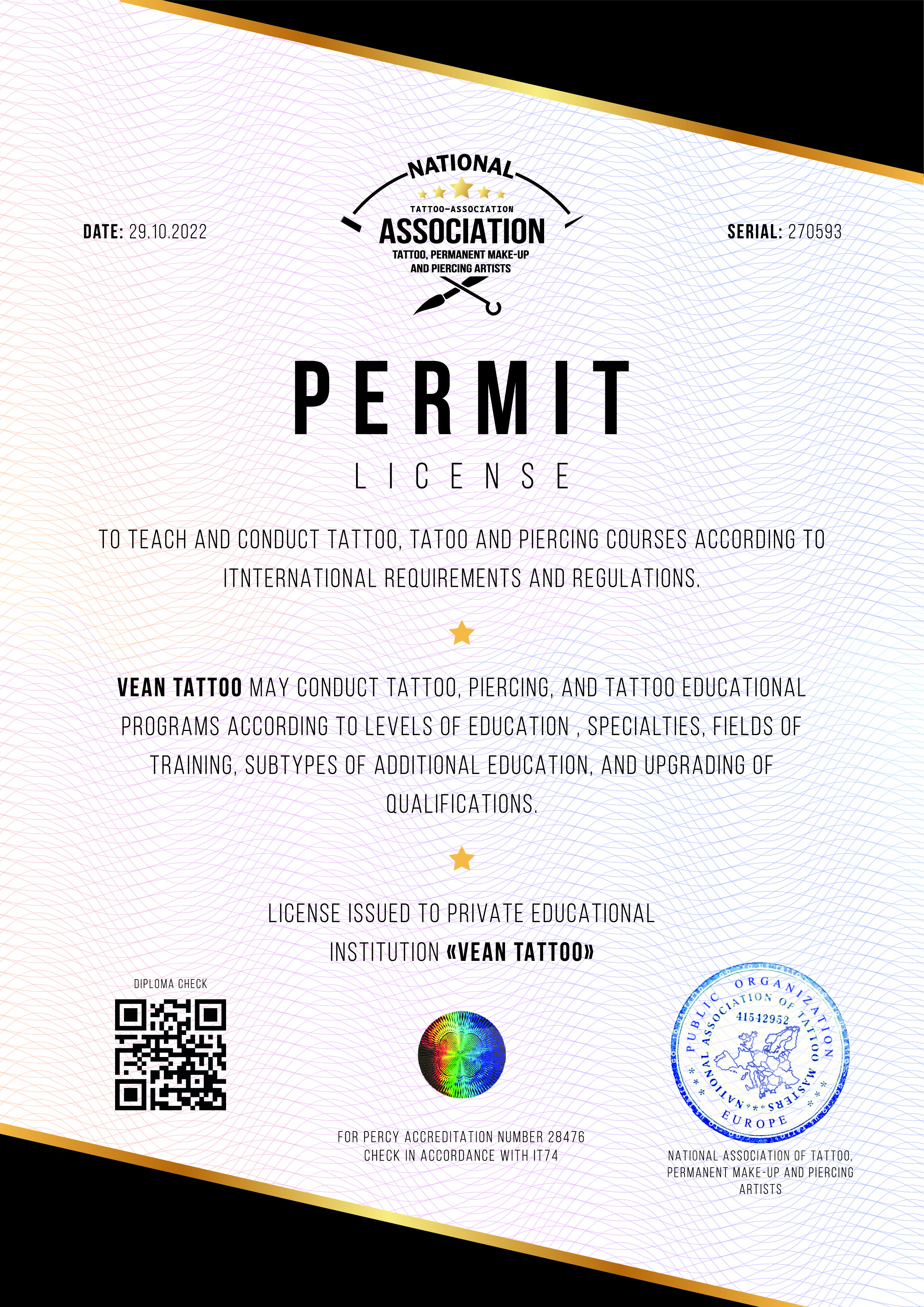 Many tattoo studios create their own certificates for their students, which do not hold official status. The VEAN company certificate is a document recognized and validated in many countries worldwide, with the option to verify its authenticity. It is important to emphasize that training is conducted exclusively offline, as the art of tattooing requires not only theoretical knowledge but also practical skills that can only be gained under the supervision of experienced mentors.