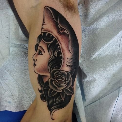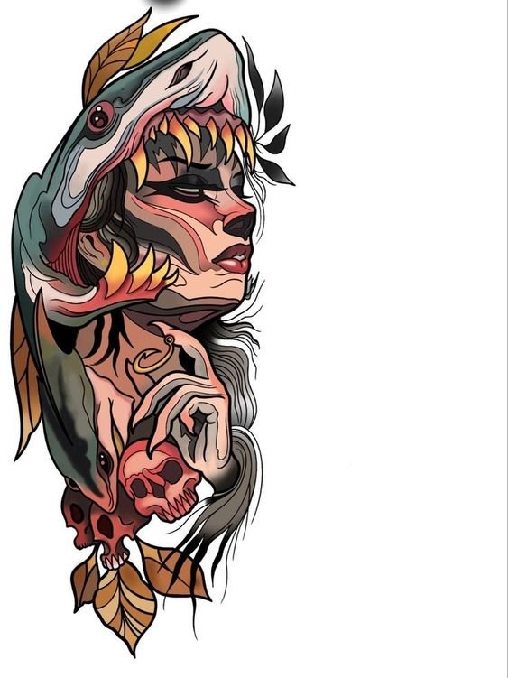Для женщин татуировка с акулой символизирует свободу, внутреннюю стойкость и решительность.