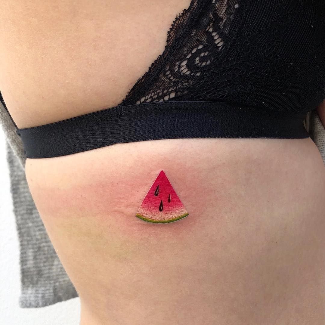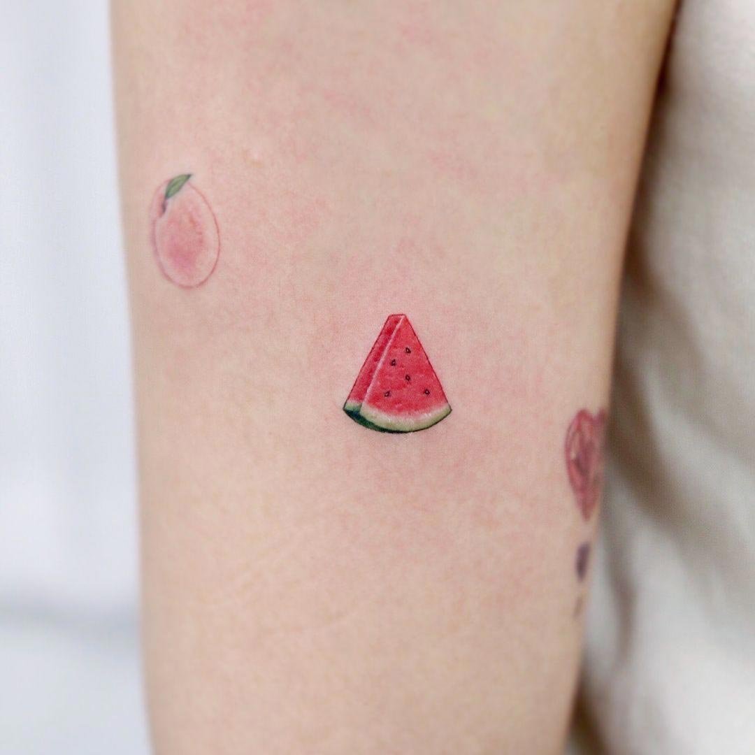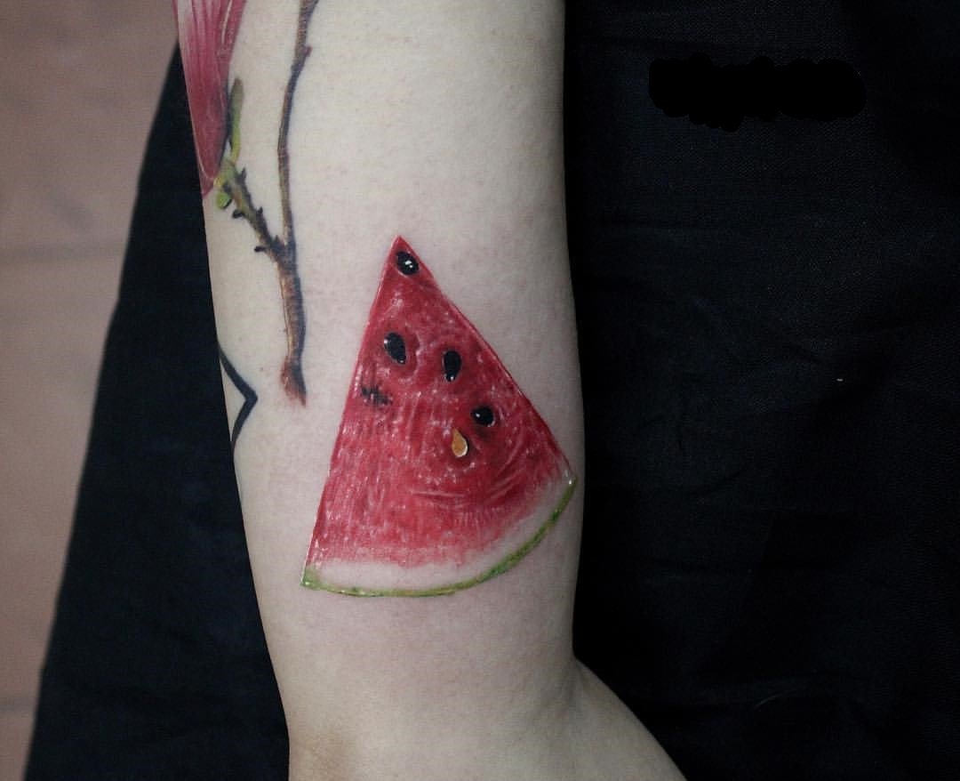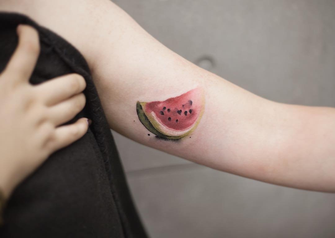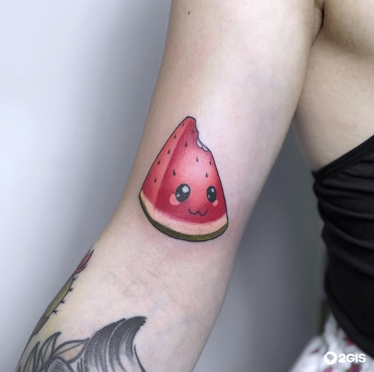 Подобное тату в виде арбуза может сказать о том, что девушка подчеркивает свою молодость и красоту, естественность и яркость.