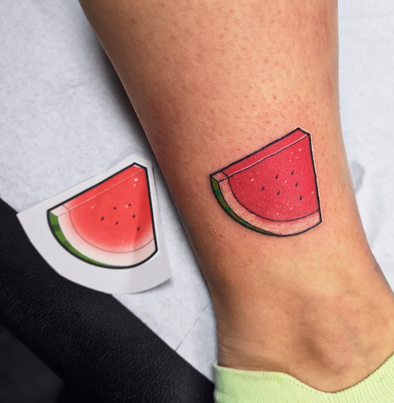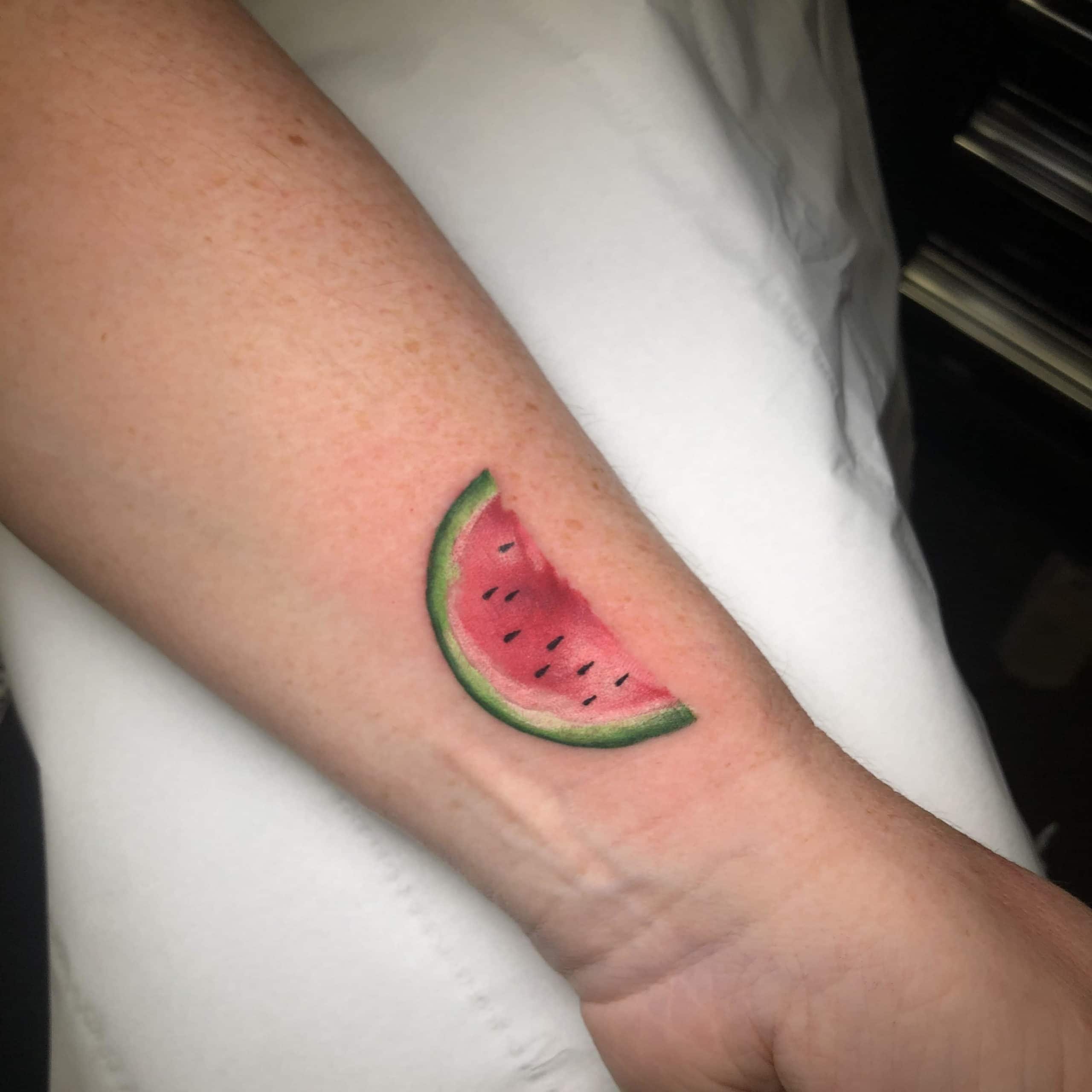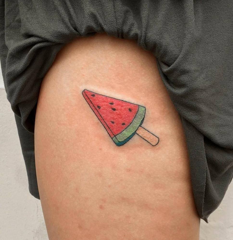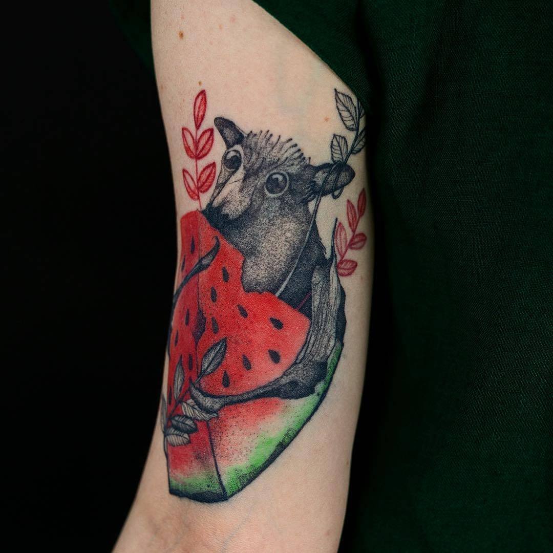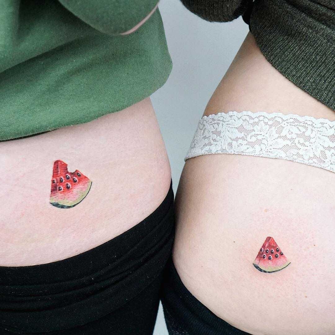 Подобное тату в виде арбуза может сказать о том, что девушка подчеркивает свою молодость и красоту, естественность и яркость.