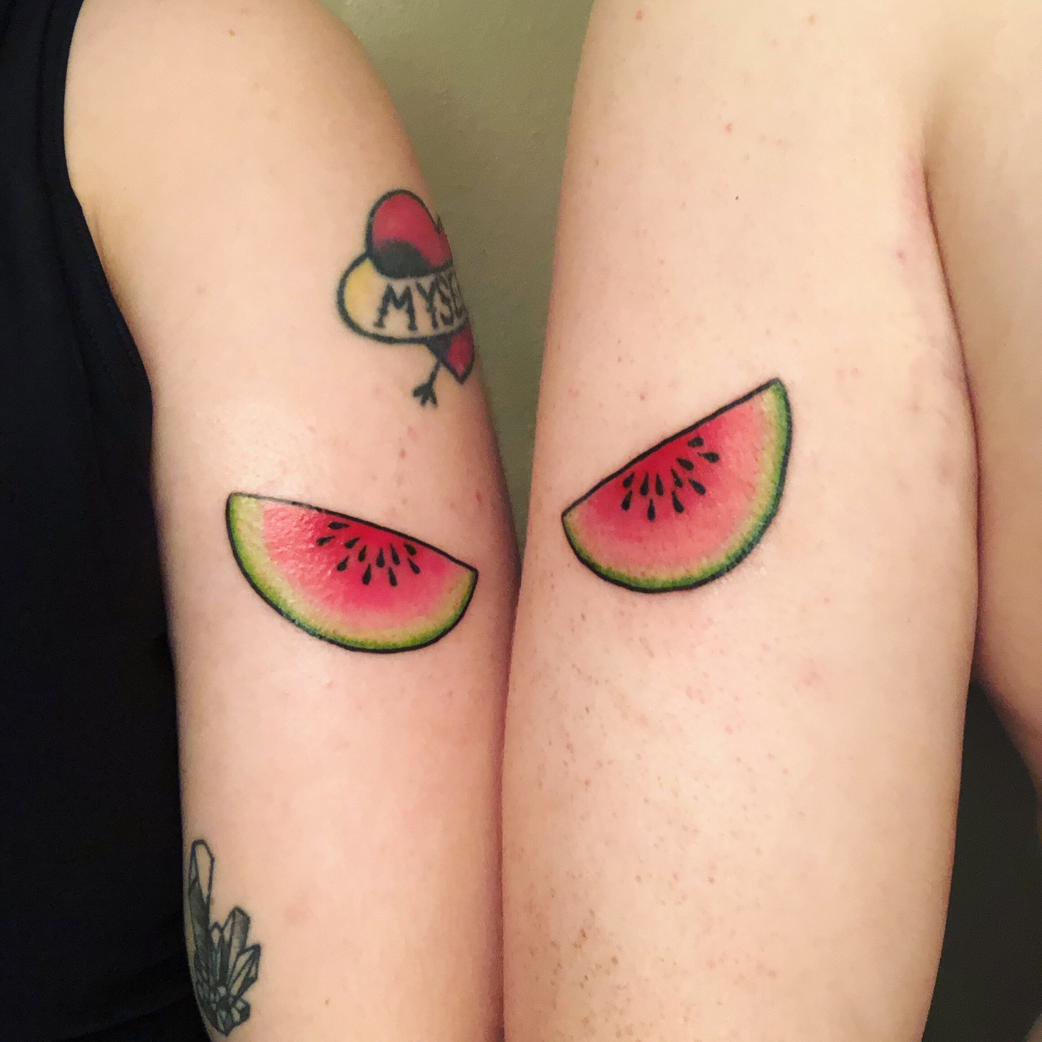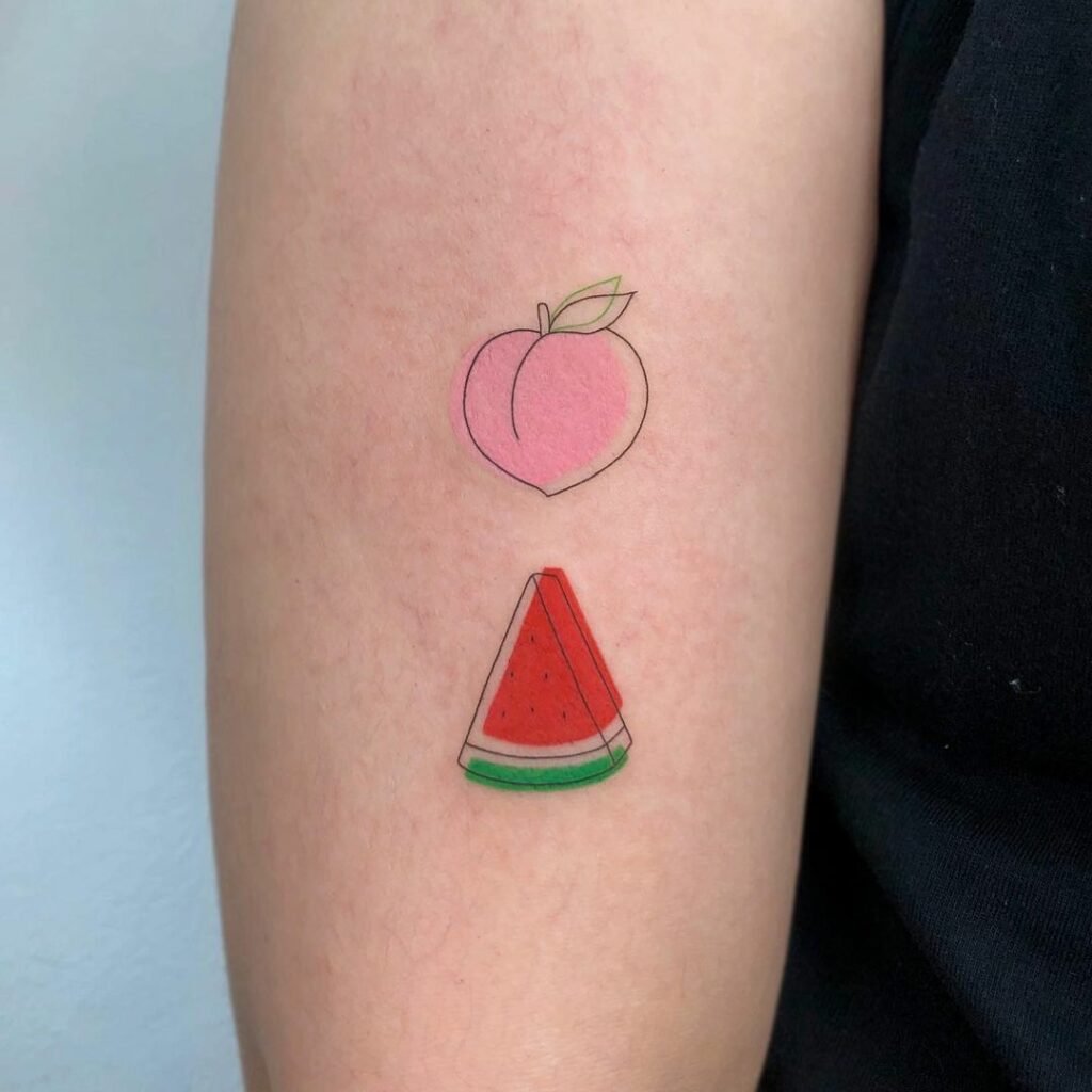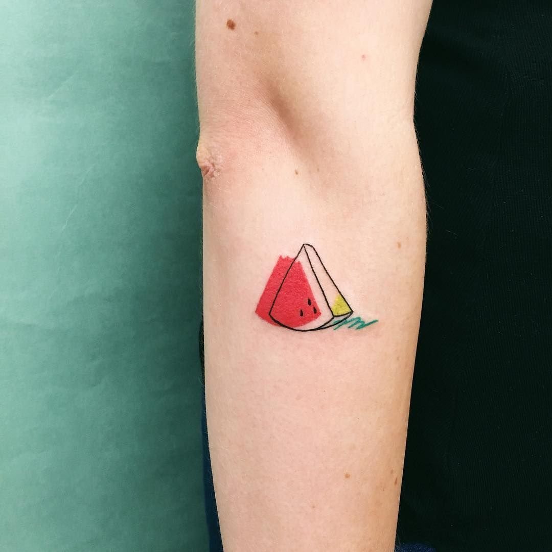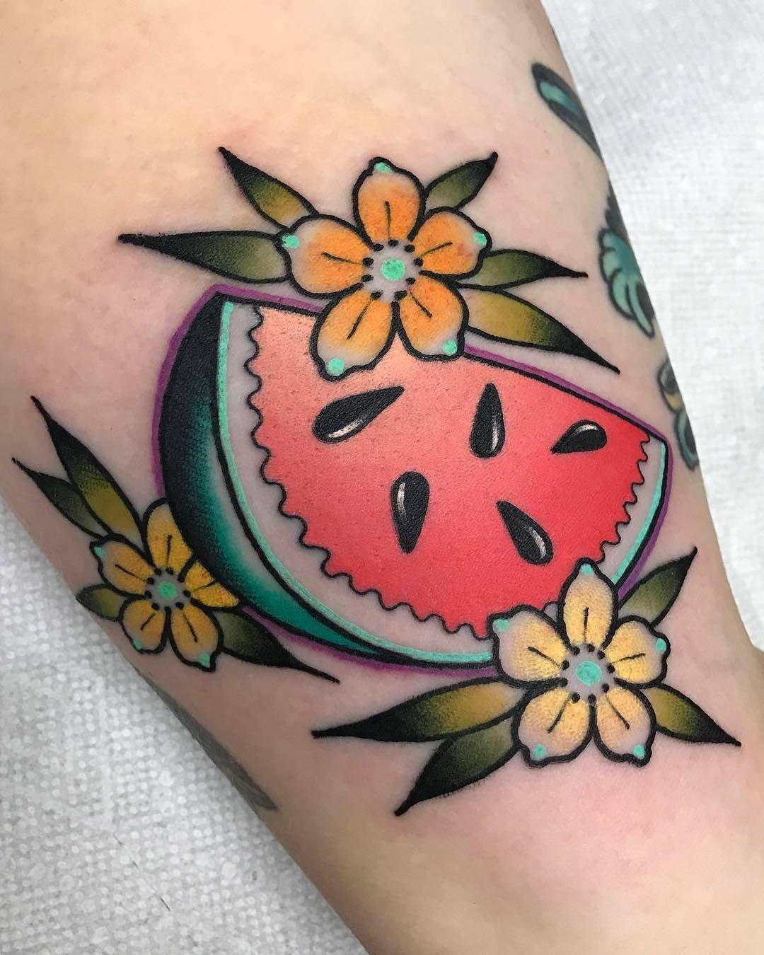 Подобное тату в виде арбуза может сказать о том, что девушка подчеркивает свою молодость и красоту, естественность и яркость.