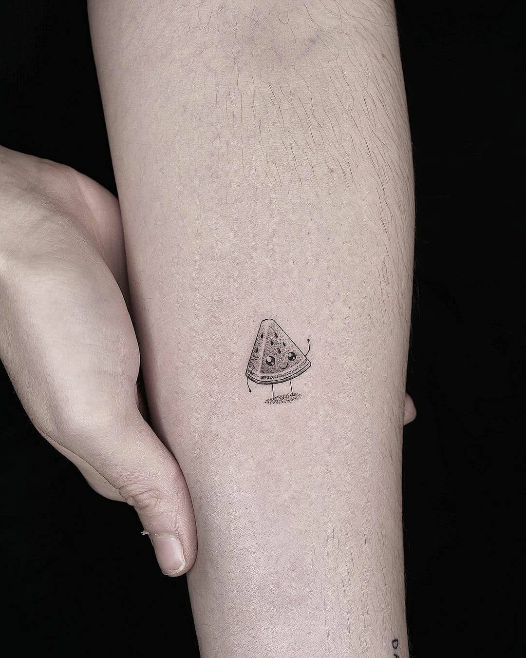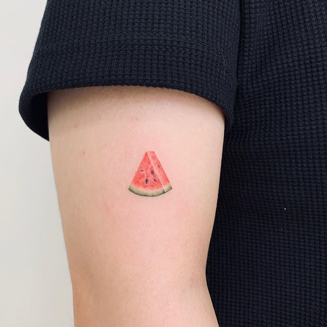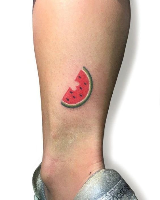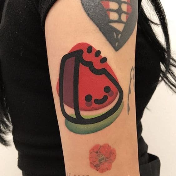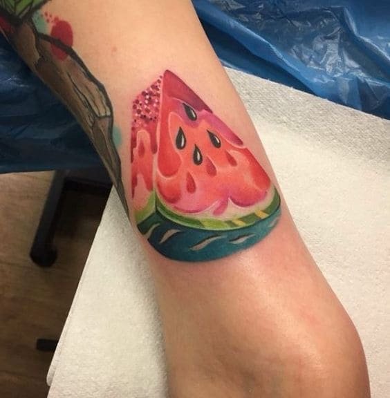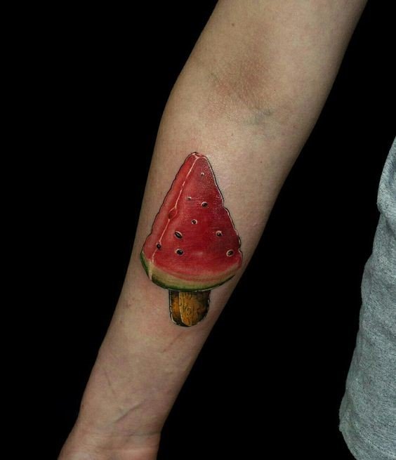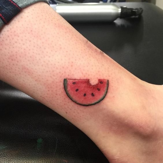Тату с арбузом может быть нанесено с большей вероятностью молодыми парнями, а место размещения – любое. Кроме того, можно изменить форму, придать черт живого существа, добавить цветов и оттенков и выполнить работу в собственном варианте, что позволит оставаться ярким и заметным.