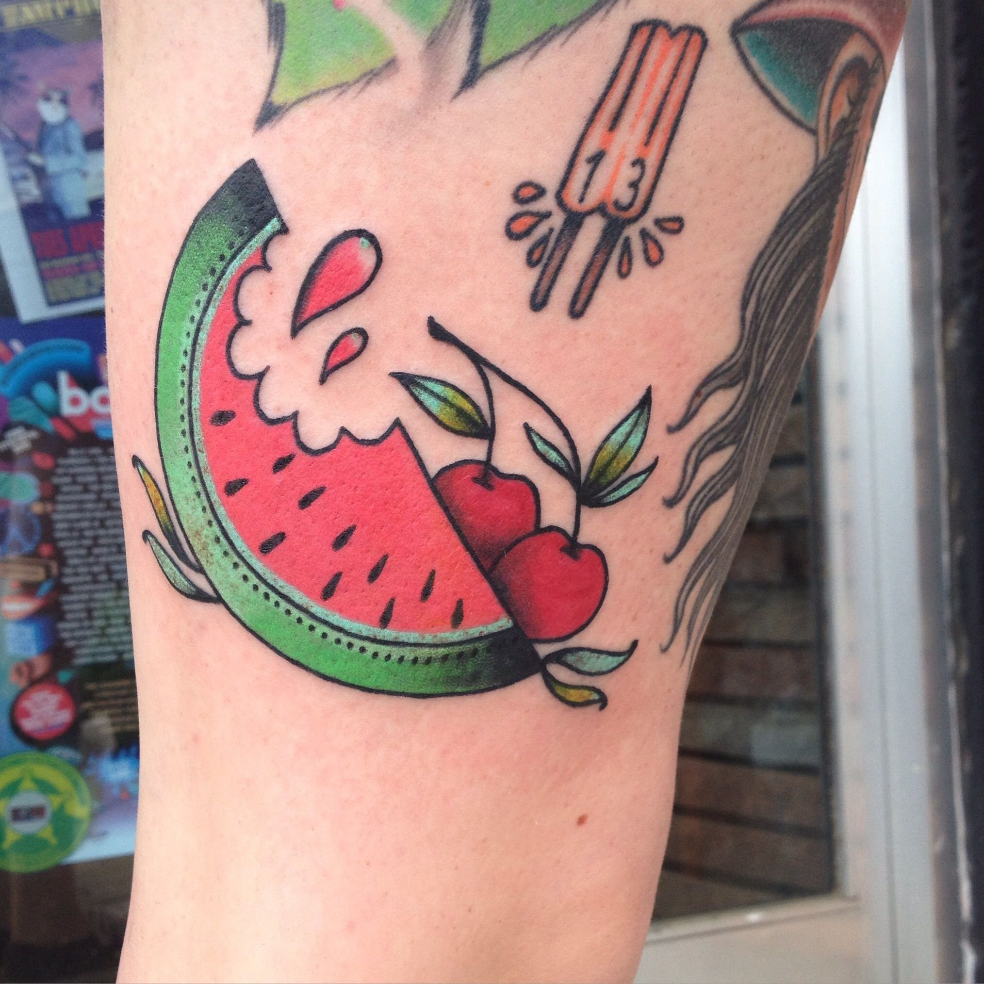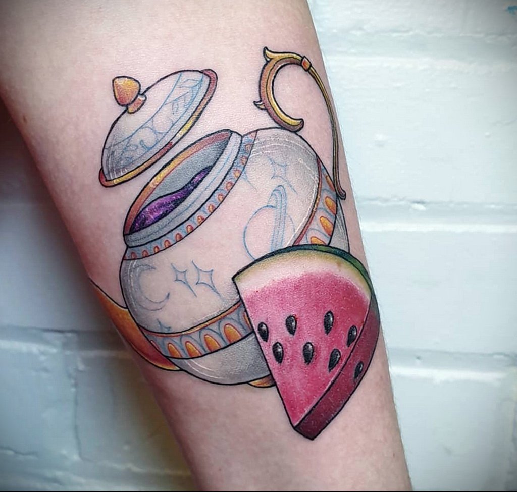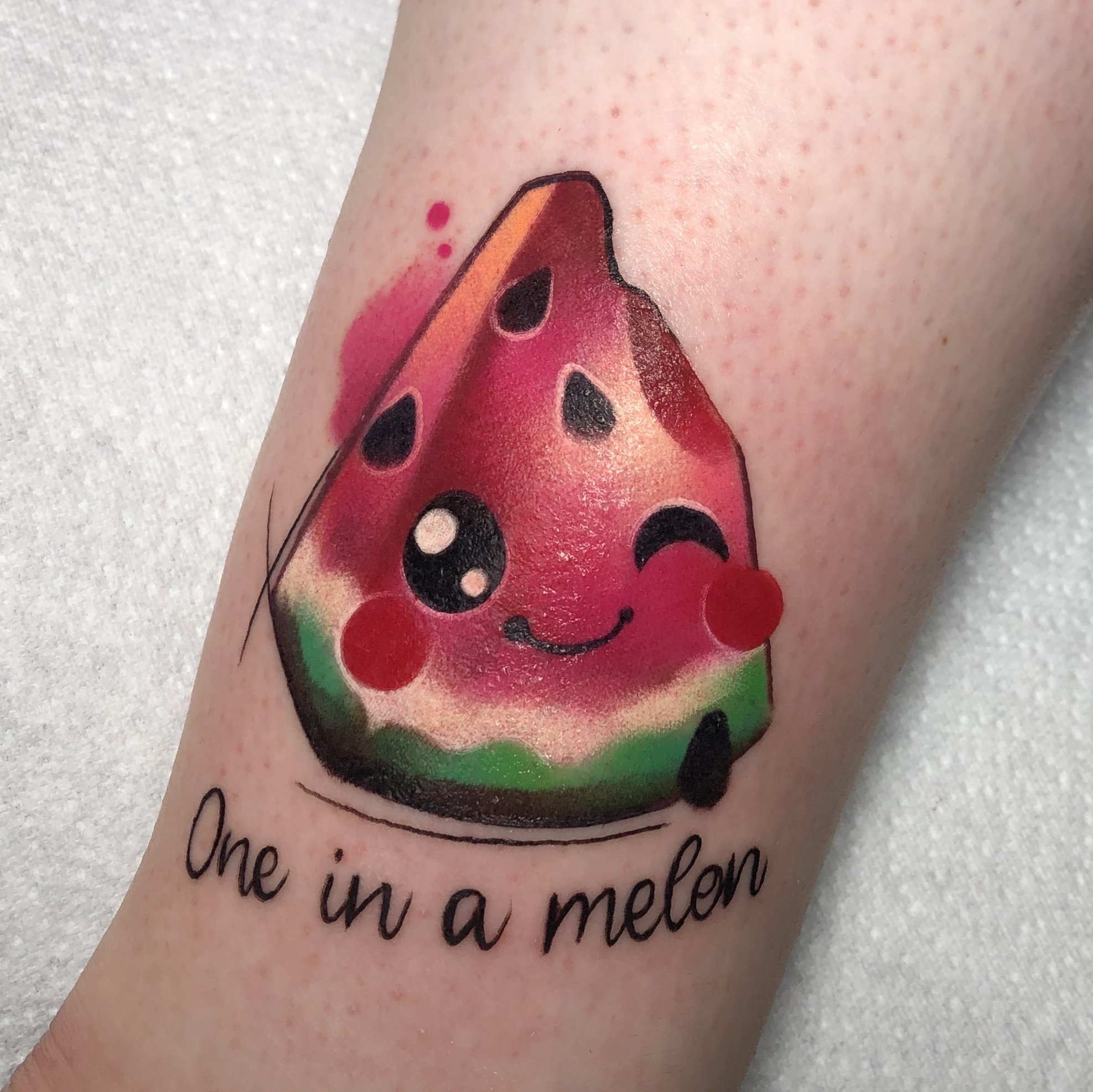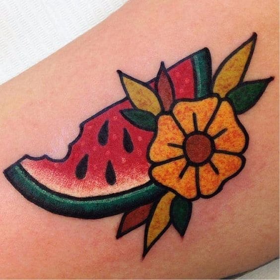 Тату с арбузом может быть нанесено с большей вероятностью молодыми парнями, а место размещения – любое. Кроме того, можно изменить форму, придать черт живого существа, добавить цветов и оттенков и выполнить работу в собственном варианте, что позволит оставаться ярким и заметным.