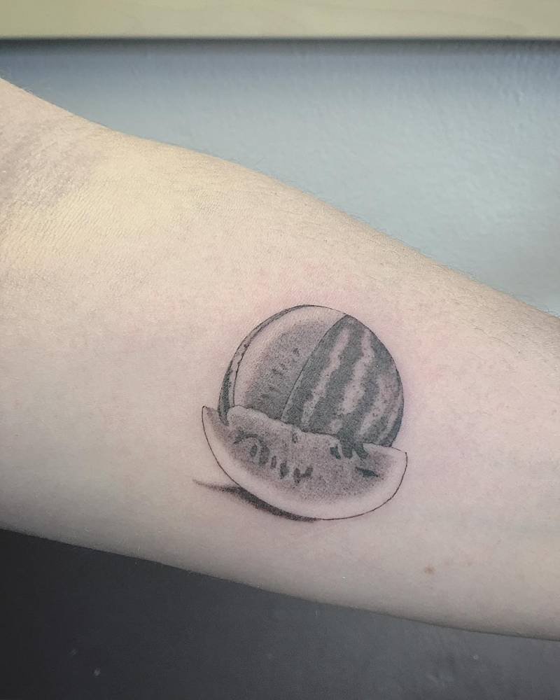 Эскиз арбуза, перенесенный на тело может говорить о многом. Сам плод подразумевает собой наличие скрытой тайны, обширного внутреннего мира: так как арбуз внешне зеленый и не привлекает собой, а внутри сладок и вызывает аппетит, он отлично подходит для такой трактовки.