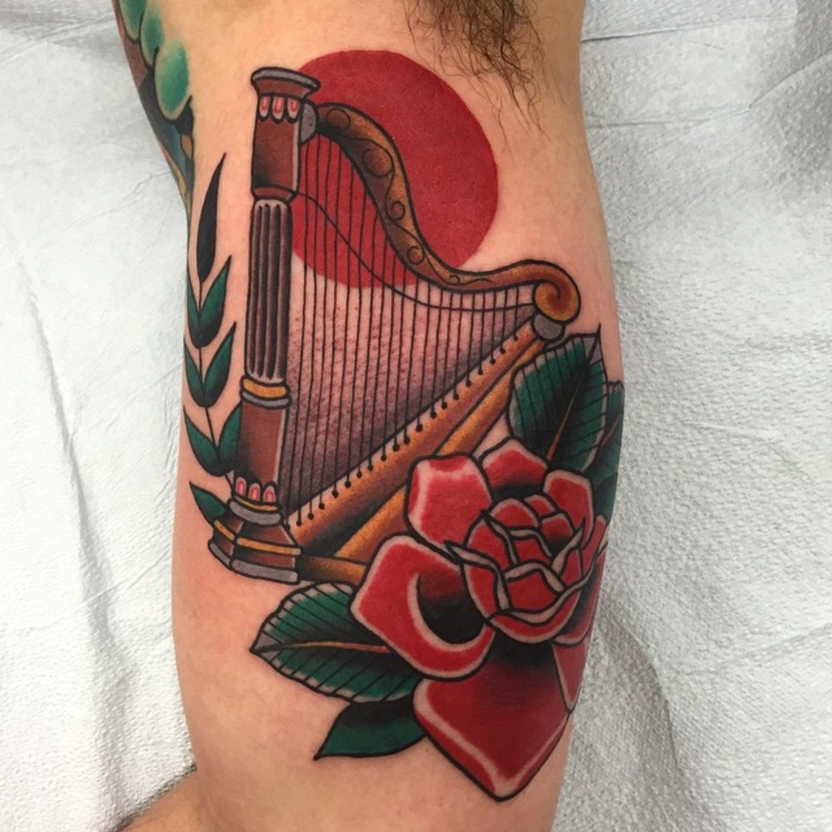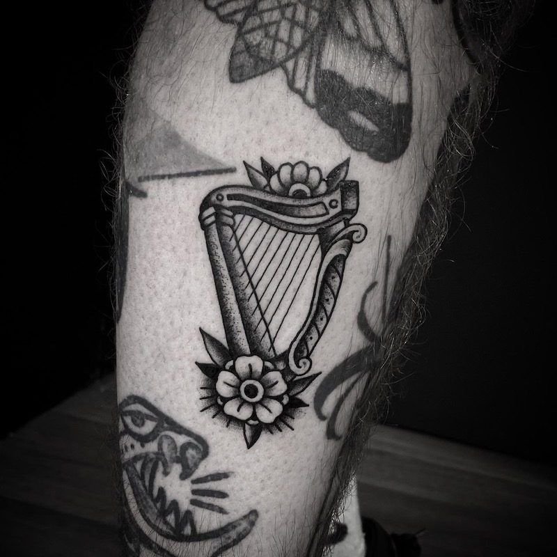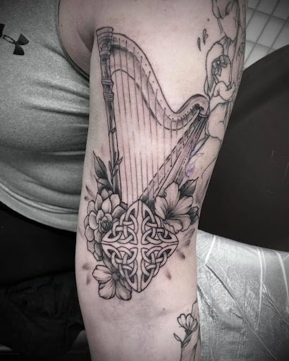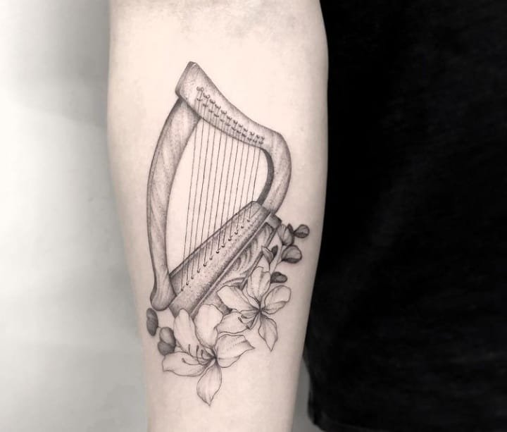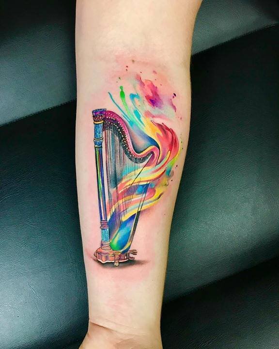 Цвет арфы на тату может быть абсолютно любым.