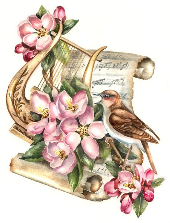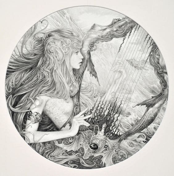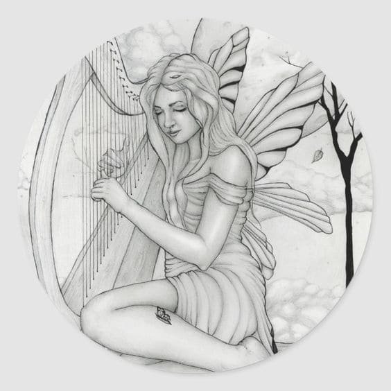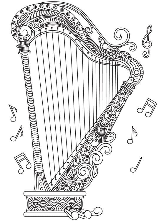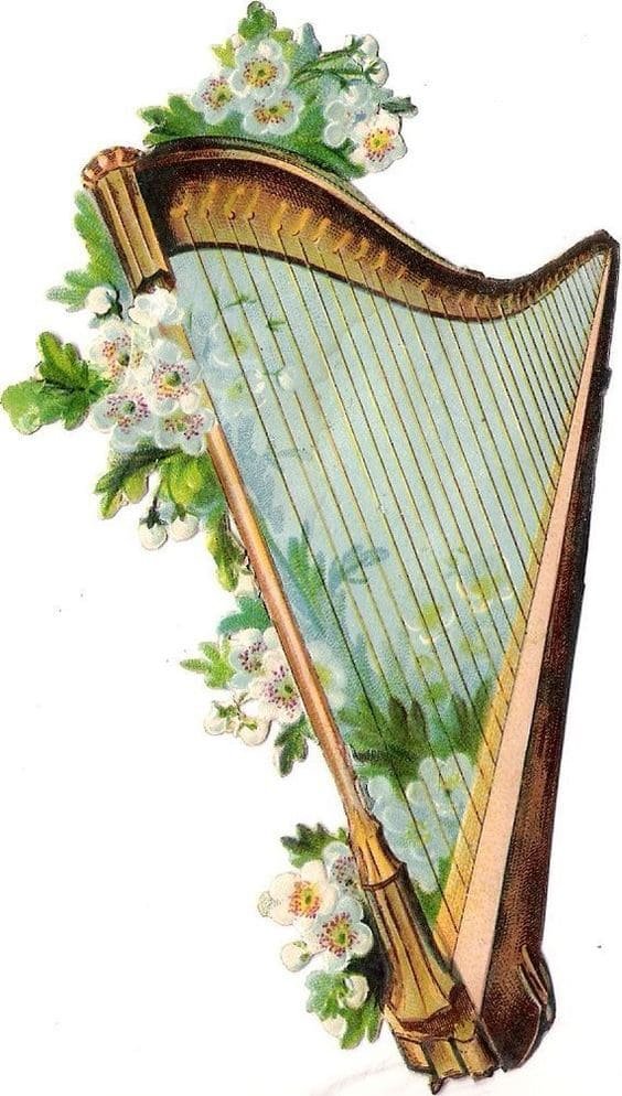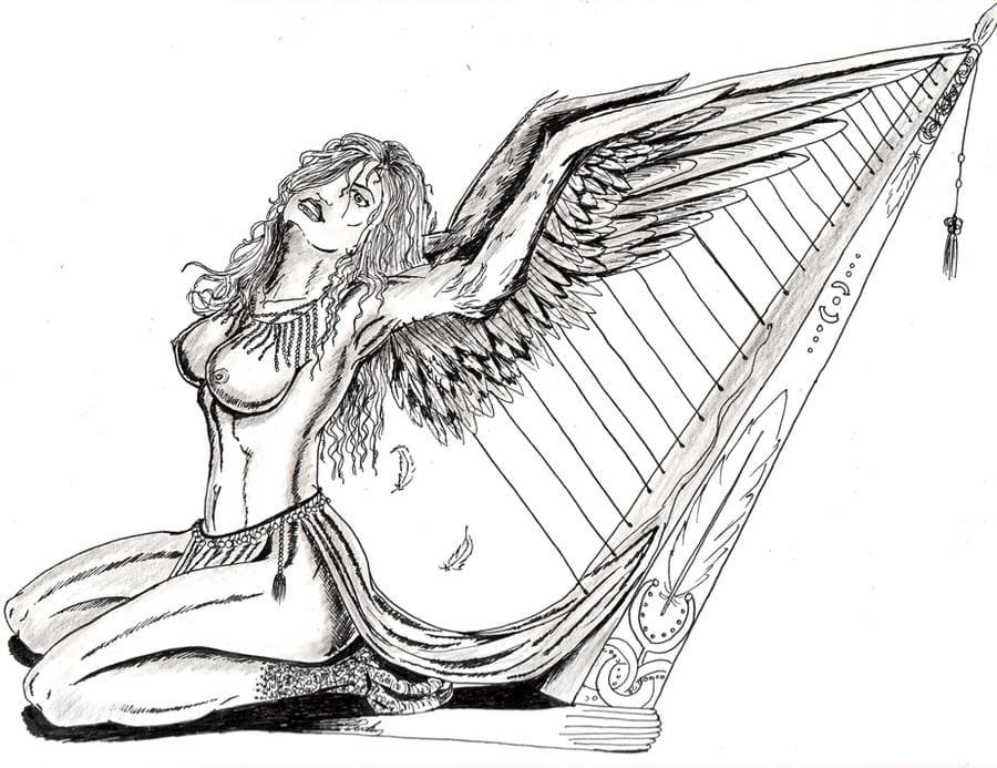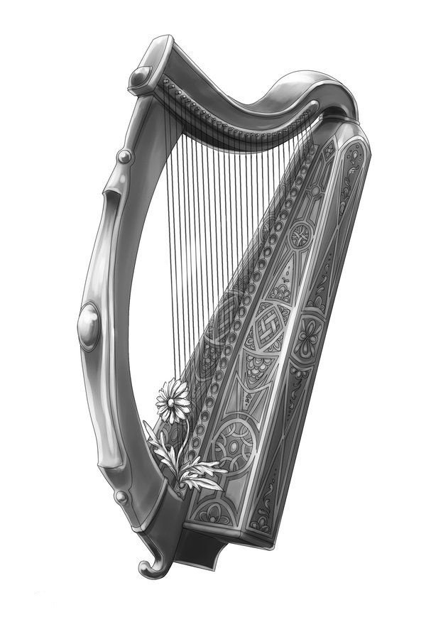 Также арфа может быть частью рисунка, который отображает более полную картину: здесь могут быть другие персонажи и предметы, что разворачивает и смысловую нагрузку изображения. Это может быть кадр из любимой постановки или зарисовка строк из эпоса или баллады.
