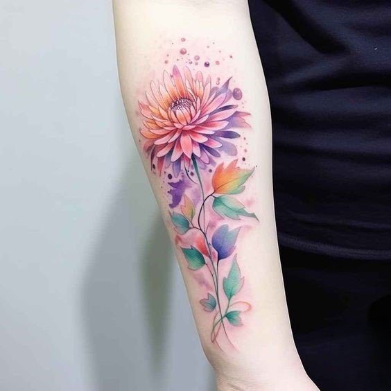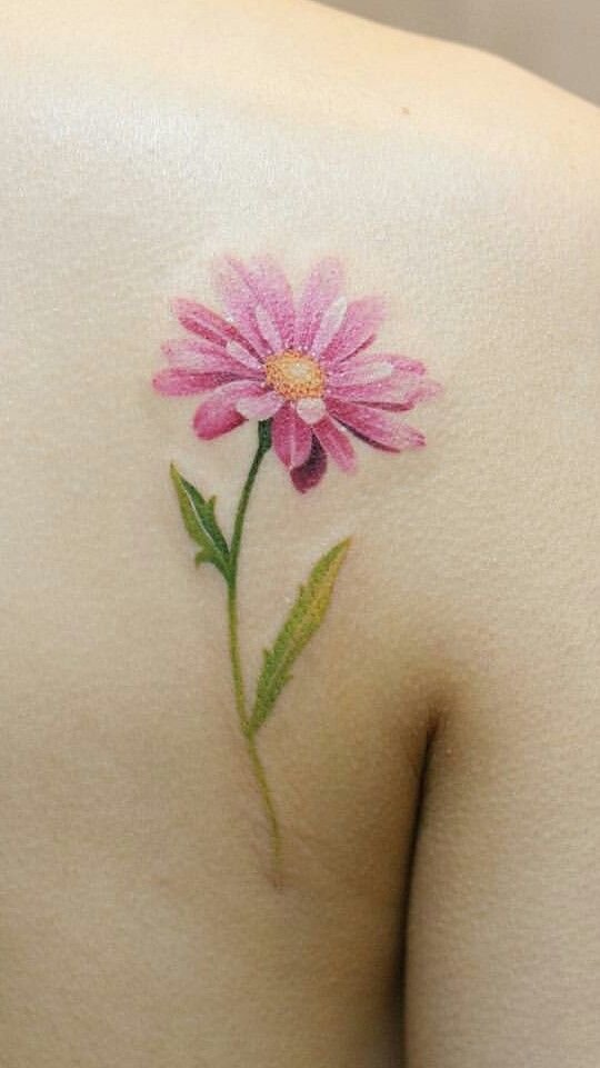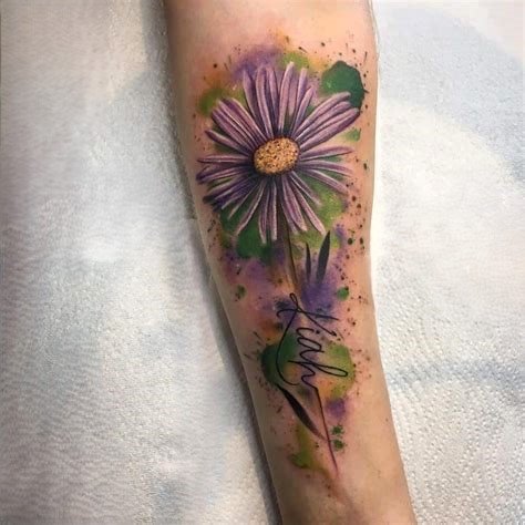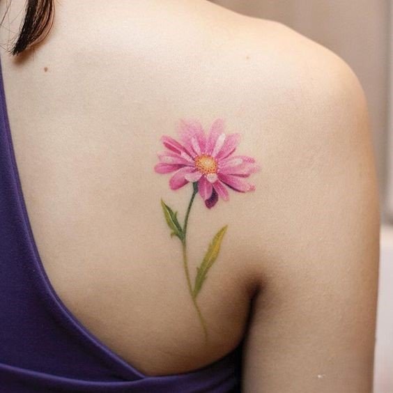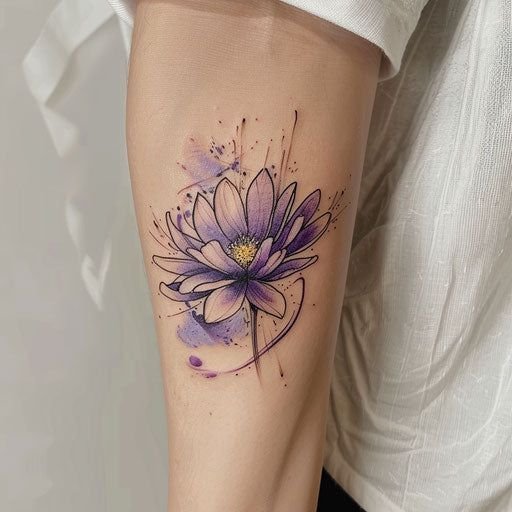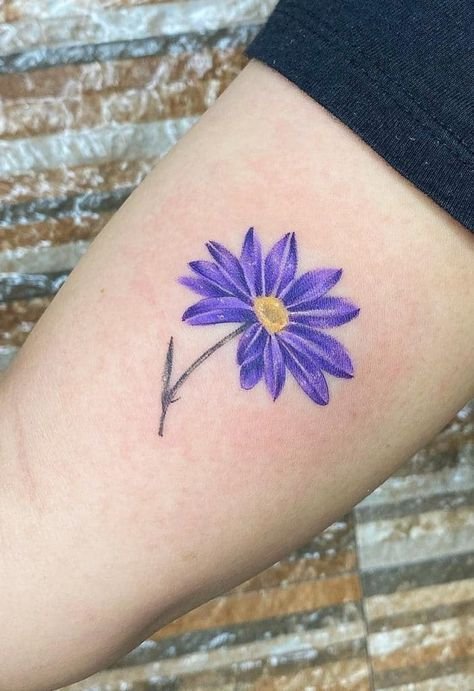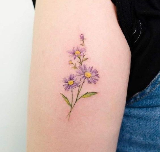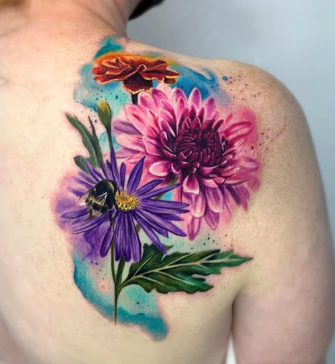 - Цветное изображение. Насыщенные оттенки фиолетового, синего или розового создают реалистичное и яркое изображение цветка, которое привлекает внимание. Цветные татуировки с астрой выглядят эффектно и стильно.