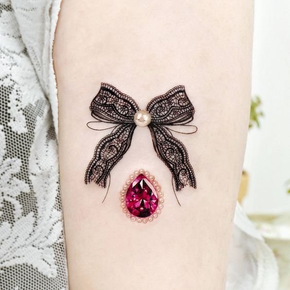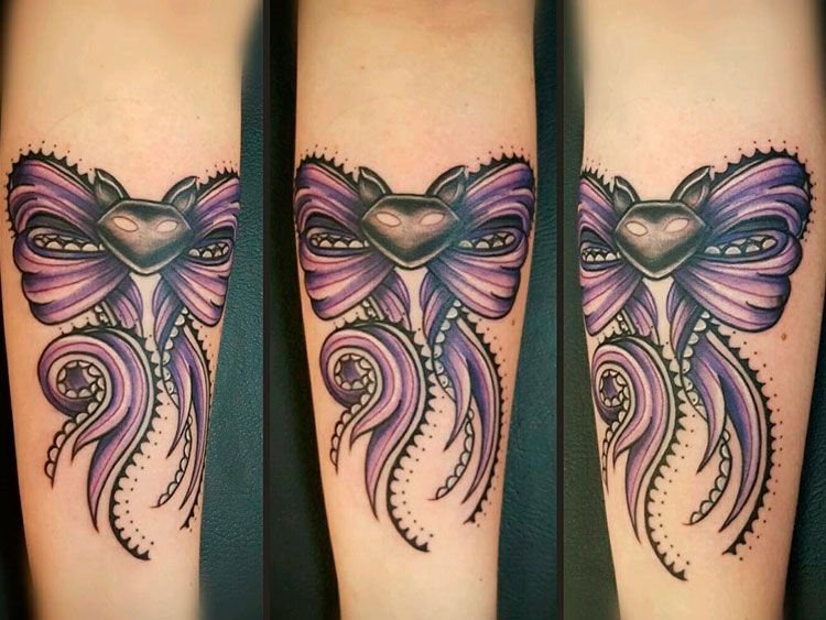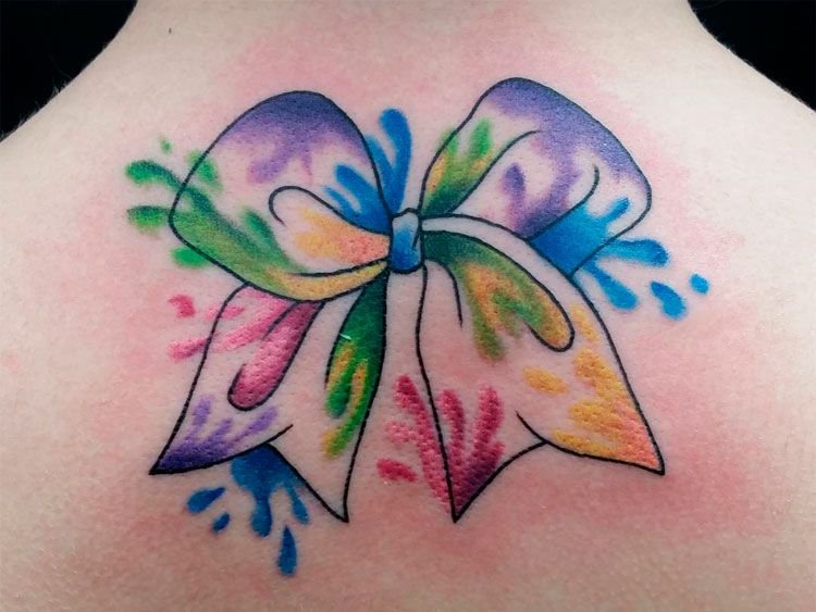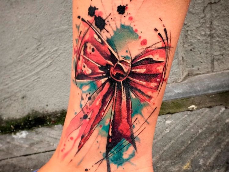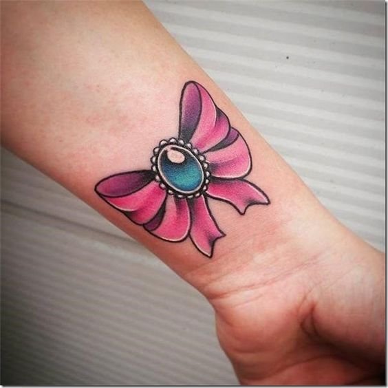 Люди, которые отдают предпочтение татуировкам с изображением бантика, чаще всего добрые, положительные, смотрят на мир с позитивом. Это очень светлые люди, излучающие позитив, радость и веселье. Обычно девушки сами вкладывают в татуировку свое особое значение, это может быть память о веселых моментах, либо важное событие. Очень оригинально выглядят изображения особой даты человека, которая украшена милым бантиком. Конкретных ограничений в нанесении изображения бантика на тело нет, каждый может выбрать место для рисунка и его цветовое соотношение. Очень красочно выглядит бантик в ярких, красочных тонах, не менее эффектно и завораживающе смотрятся бантики исполнены в черных тонах. Особенно великолепно выглядит ажурный бант, украшающий запястье, грудь либо шею девушки.