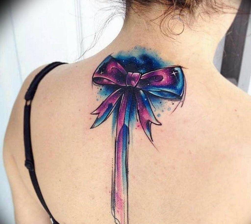 Так же прекрасно тату бантик подходит и скромным девушкам, ведь изображение абсолютно не несет в себе негатив, а наоборот лишь позитивные обозначения. К тому же татуировку можно сделать небольшого размера, чтобы при надобности ее можно было легко спрятать от лишних глаз. Чаще всего девушки предпочитают набивать такой рисунок на запястьях, лодыжках, ступнях, животах, под, либо сбоку груди. Весьма оригинально выглядит аккуратный бантик и на задней части шеи. Обычно изображение банта используют в качестве дополнения, либо он взят за основу татуировки, таким образом изображение становится более ярким и красочным.
