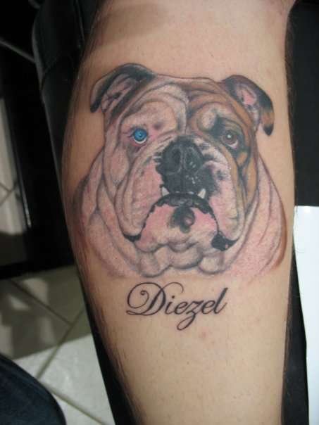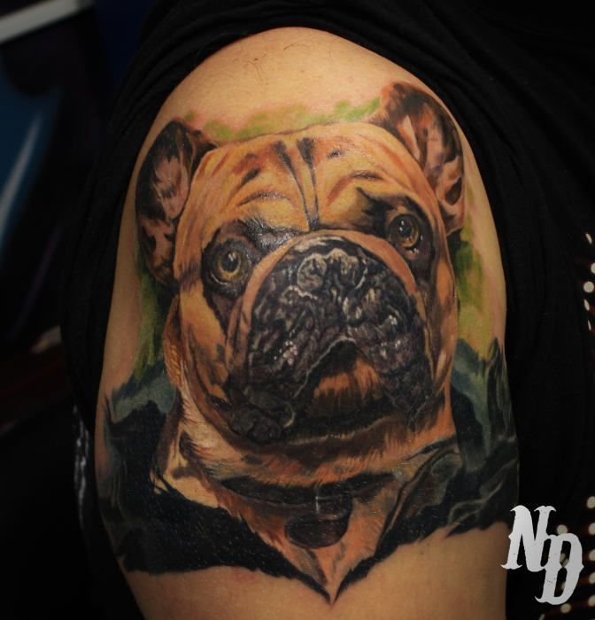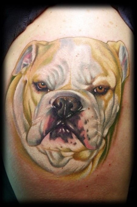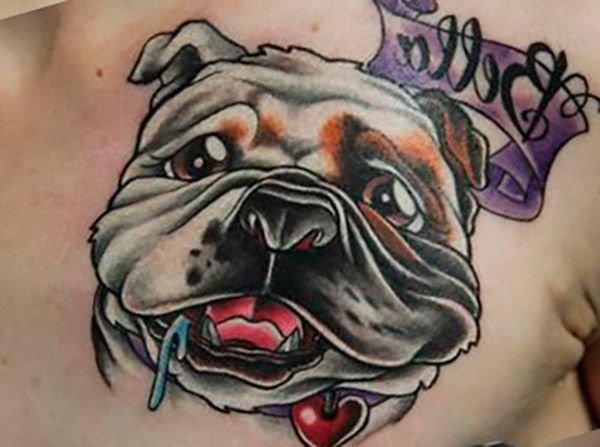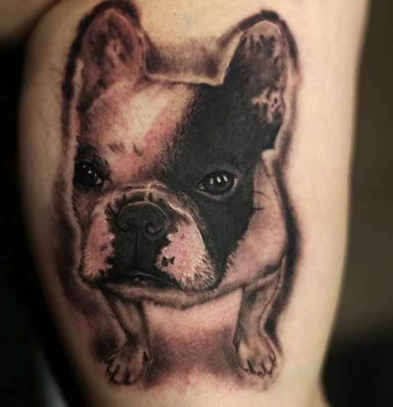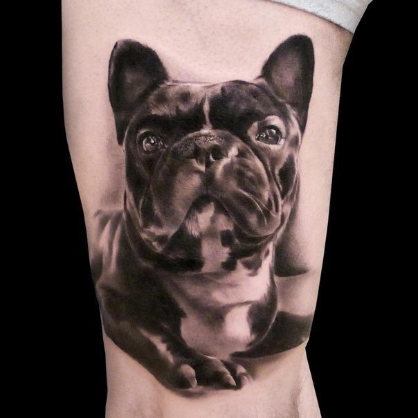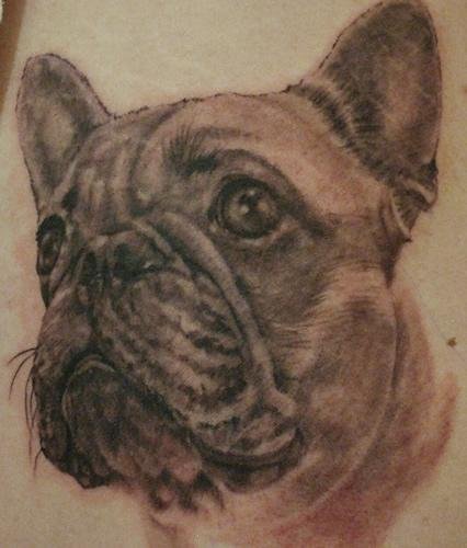 - Татуировки с реалистичным изображением бульдога чаще всего предпочитают люди, у которых имеется такой питомец. Таким образом они демонстрируют любовь к своему четырехногому другу. Либо же данное изображение говорит о том, что человеку просто нравиться такая порода собак.