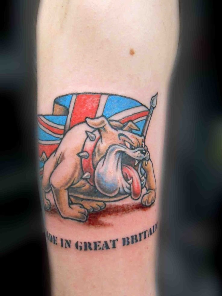 Во втором случае бульдога изображают на фоне национального флага или с изображением герба. Если отдалится от всех стран, то в общем татуировка бульдога обозначает что человек терпелив, бесстрашен, обладает мужеством и отвагой, упорный, постоянный и способен защитить. Если же говорить о конкретной трактовке изображения, то в таком случае стоит учитывать и качества самого обладателя нательного рисунка. На некоторых татуировках бульдог может выглядеть весьма устрашающе, такие татуировки чаще всего служат человеку в качестве оберега на всю жизнь. Если углубится в историю, то в древние времена славяне придавали собакам особые силы, они верили что эти животные способны предсказывать будущее.