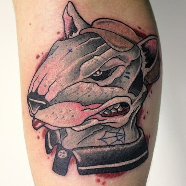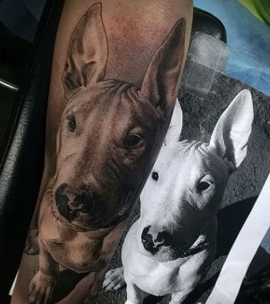 Тату бультерьер выполняется как в цветном, так и в черно-белом формате.