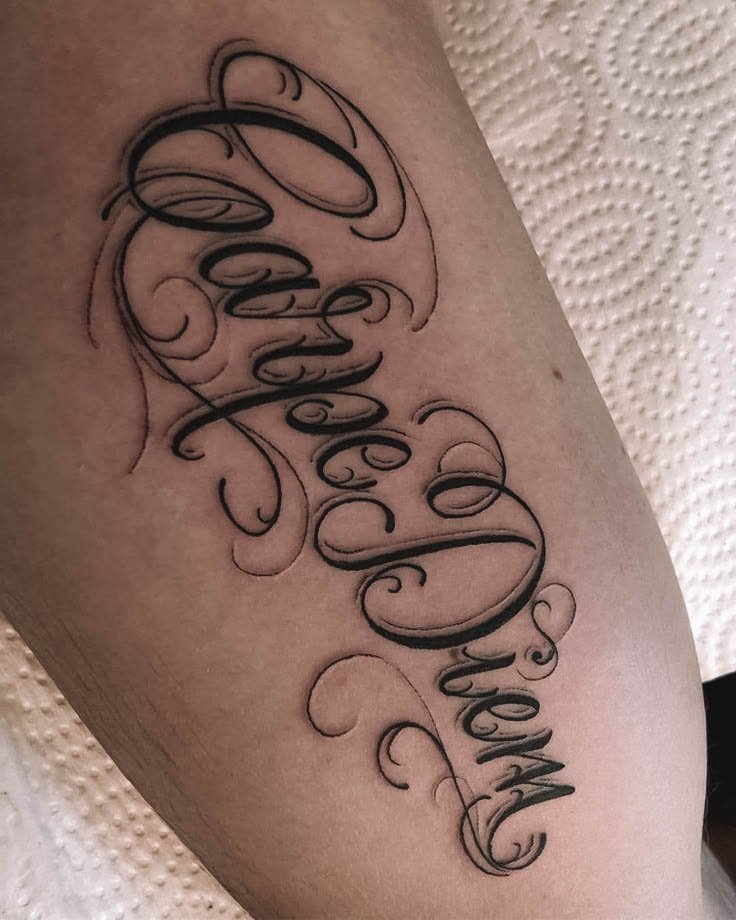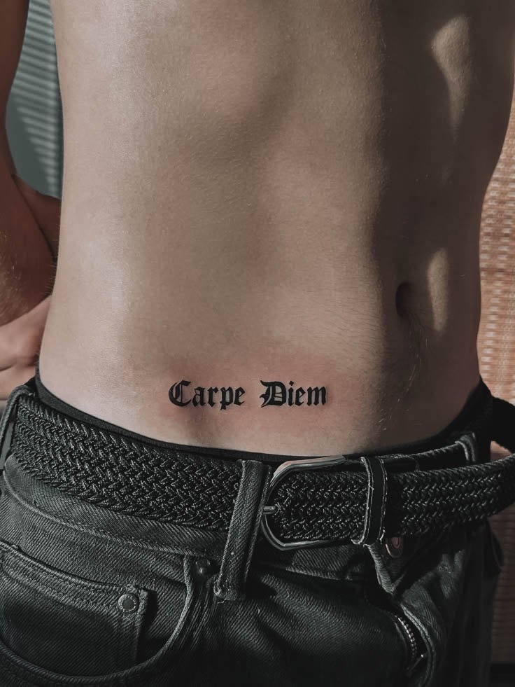 Тату с надписью Carpe Diem может быть выполнено в разных стилях: каллиграфия, минимализм, готический шрифт, нео-традишнл или акварель.
