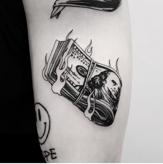 - Эскизы денег, а именно бумажных купюр, говорят о хорошем финансовом положении человека. Так же, такое изображение говорит о том, что человек любит деньги и старается накопить их как можно больше. Тату денег часто выступает стимулом для обладателя нательного изображения, помогает человеку быть уверенным в себе и идти к поставленной цели.