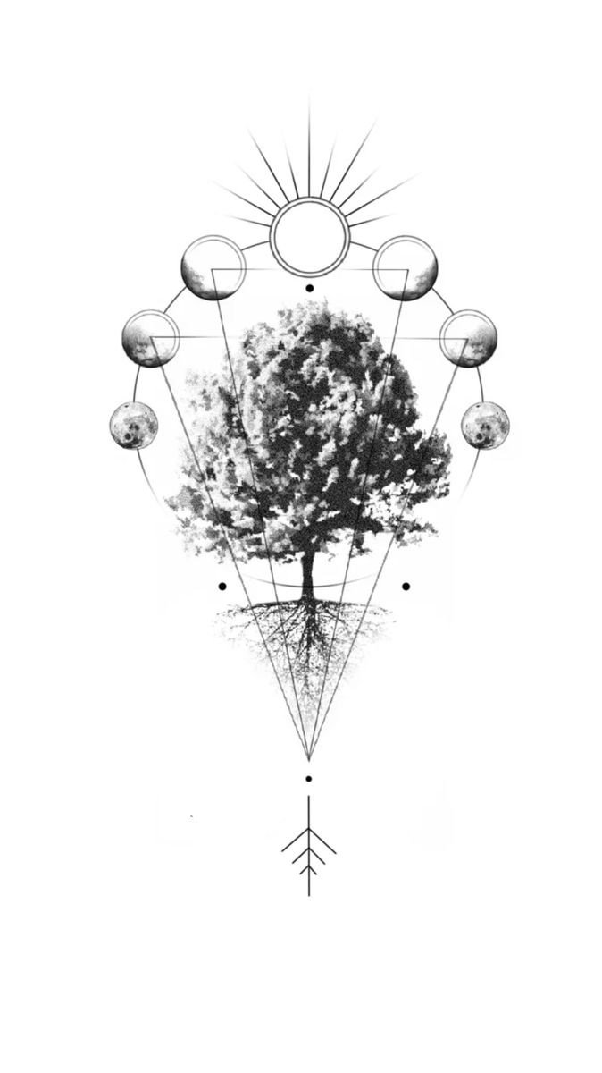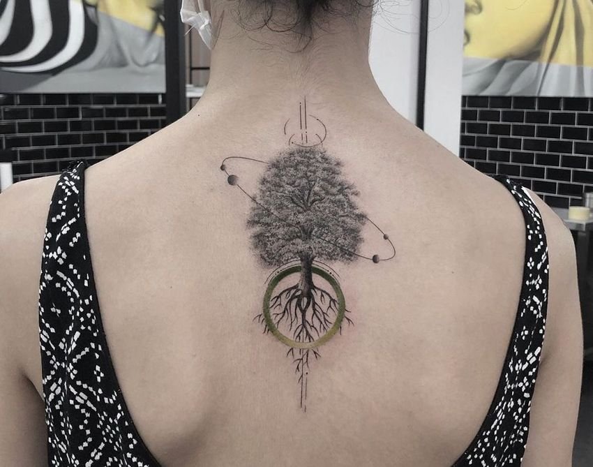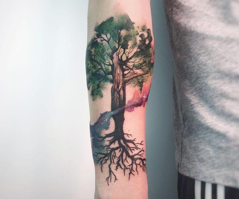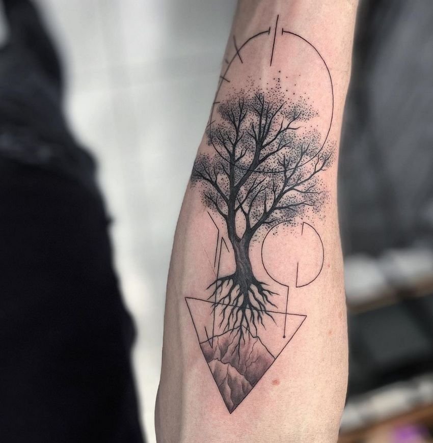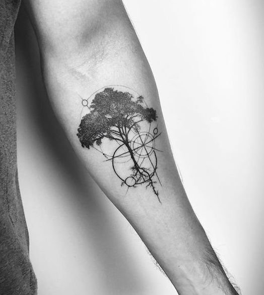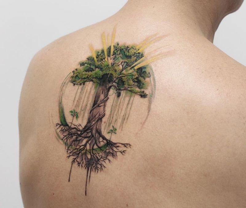 На рисунках данного дерева видно, как его густые ветки и такие же густые корни переплетаются и сплетаются между собой, образуя таким образом круг. Татуировка с Древом жизни является обозначением бесконечности, крепкой связи предков и потомков, непрерывности. Также является олицетворением зарождения жизни, началом всего. Кельты по своему описывали Древо: ствол являлся знаком реального мира, корни представляли собой загробный мир, а ветви являлись объединением двух миров. Египтяне верили, что именно из этого древа появились боги Озирис и Изида. Жители Китая связывали данное древо с бессмертием, в их народе оно почиталось. Татуировка, в которой дерево охраняет дракон, олицетворяет бессмертие.