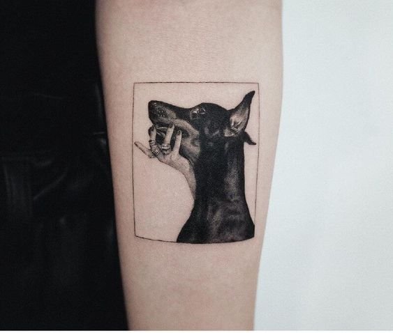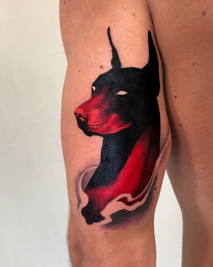 - Так же, как и другие породы собак, доберман - это крепкая защита. Поэтому и татуировка с доберманом несет в себе обозначение защиты. В данном случае, татуировка говорит о своем обладателе что он спокойный человек, но не стоит обижать его близких и родных людей, если не хотите увидеть его агрессию.