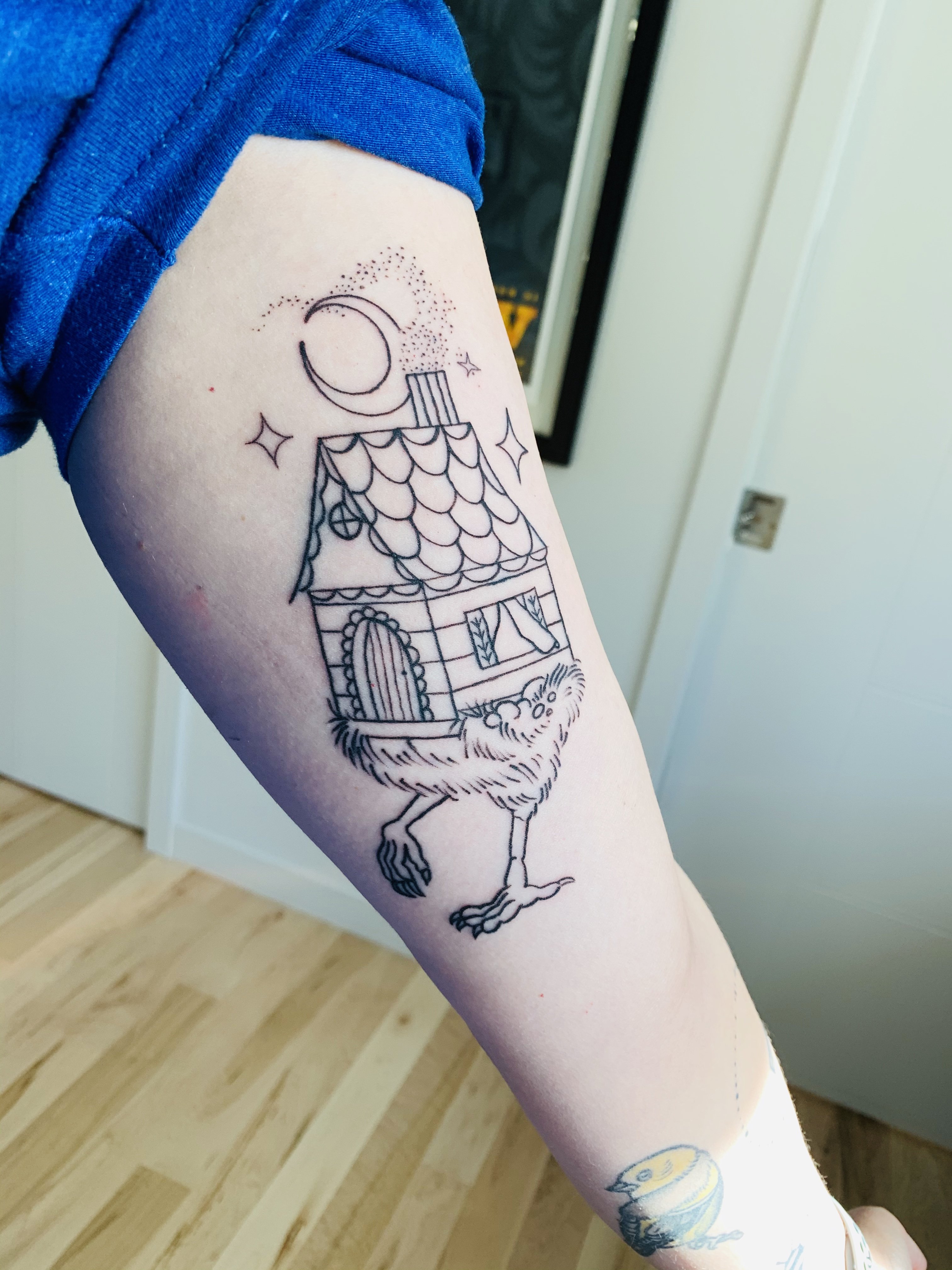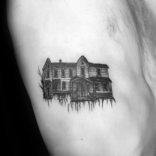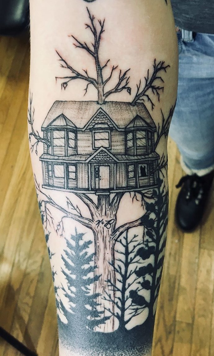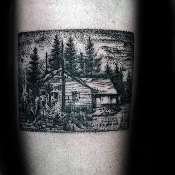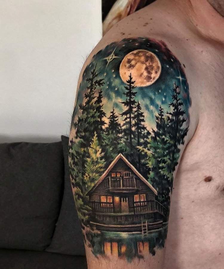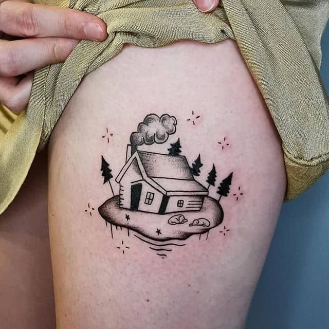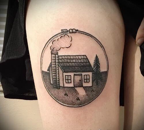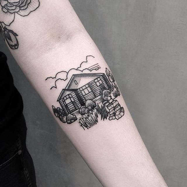 - Дом в лесу – мечта многих мужчин, но и женщин он привлекает не меньше. Тату с ним будет значить желание уйти от шума большого города, поразмыслить о жизни, помечтать. Тату дом будет выбором для уединенных личностей, а также тех, кому приятен комфорт одиночества. Такой домик позволит наконец-то написать книгу, давно засевшую в голове, или же картину, наброски которой могут стать подспорьем для тату.