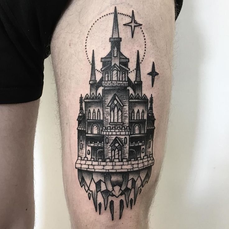 - Тату с замком говорит о его обладателе, как о загадочной и неординарной личности. Такой человек может удивить даже после годов общения, он интересен и может быть немного скрытным. Тем ни менее, замок будет нести все тот же уют и защиту. Его каменные стены не пропустят проблемы в жизнь родных и близких, а помпезность сооружения будет привлекать внимание окружающих обладателя работы людей еще не один год.