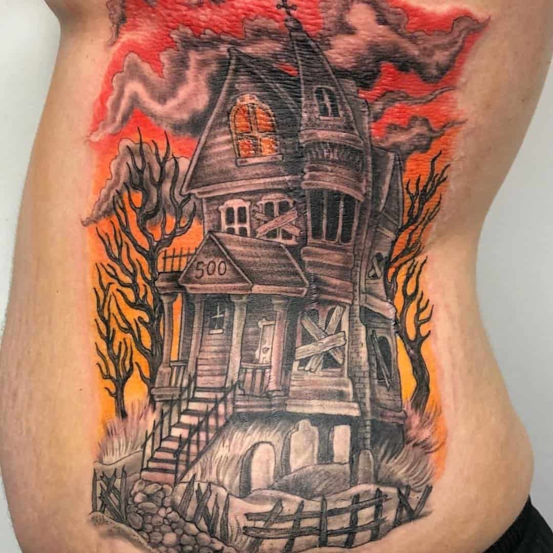 Тату с домом может говорить и о том, что человек привязан к своему образу жизни, при этом любит комфорт и спокойствие. Довершить работу можно жильцами дома, надписями с приятными сердцу словами. Цвета могут быть как мягкими, так и насыщенными и яркими. Забор около дома также укажет на защищенность и желание оградиться от окружающего шума мира.