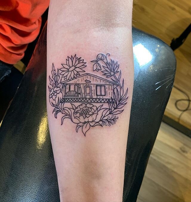 - Дачный домик сразу ассоциируется с летом и досугом в нем. Это приятные воспоминания об отдыхе, о свободе от дел и работы. Тут могут быть добавлены такие элементы, как рыбак, сосредоточенный на удилище, работа также может быть украшена деревьями, цветами и растениями, которые украсят татуировку. Свежесть природы, зелень и животные сделают работу легкой и ненавязчивой.