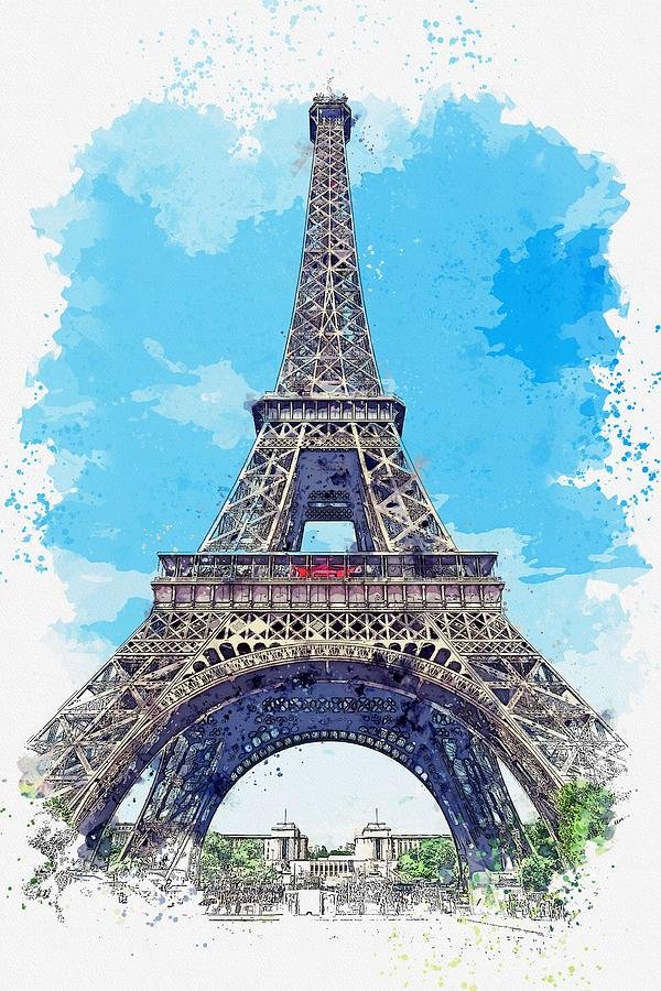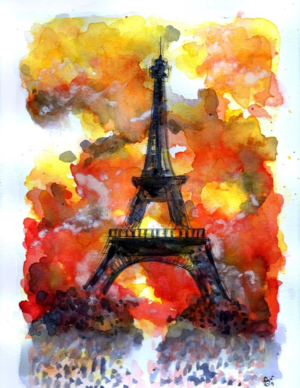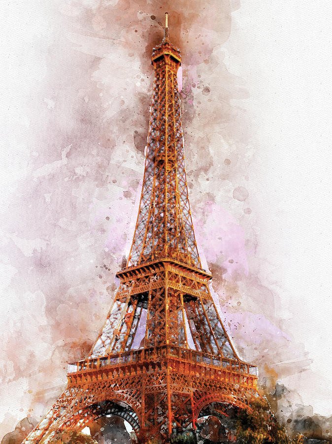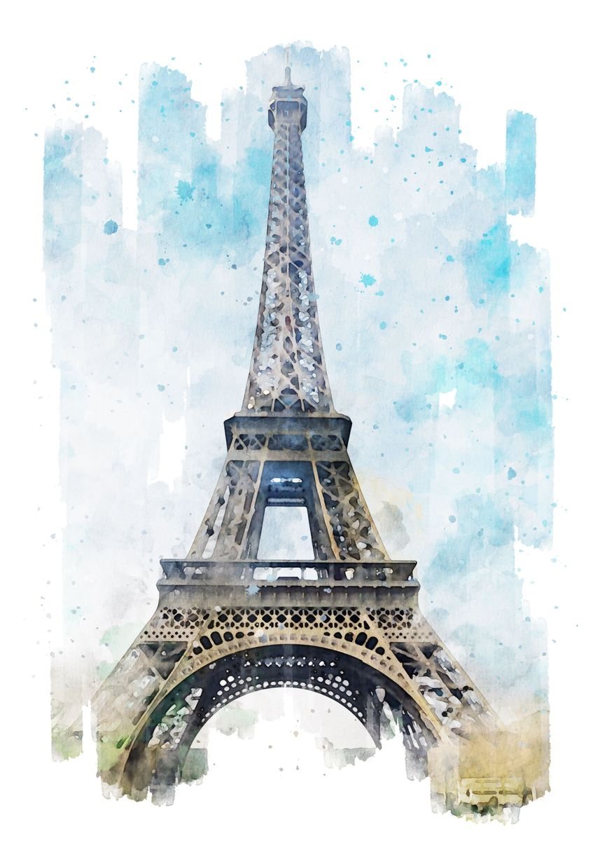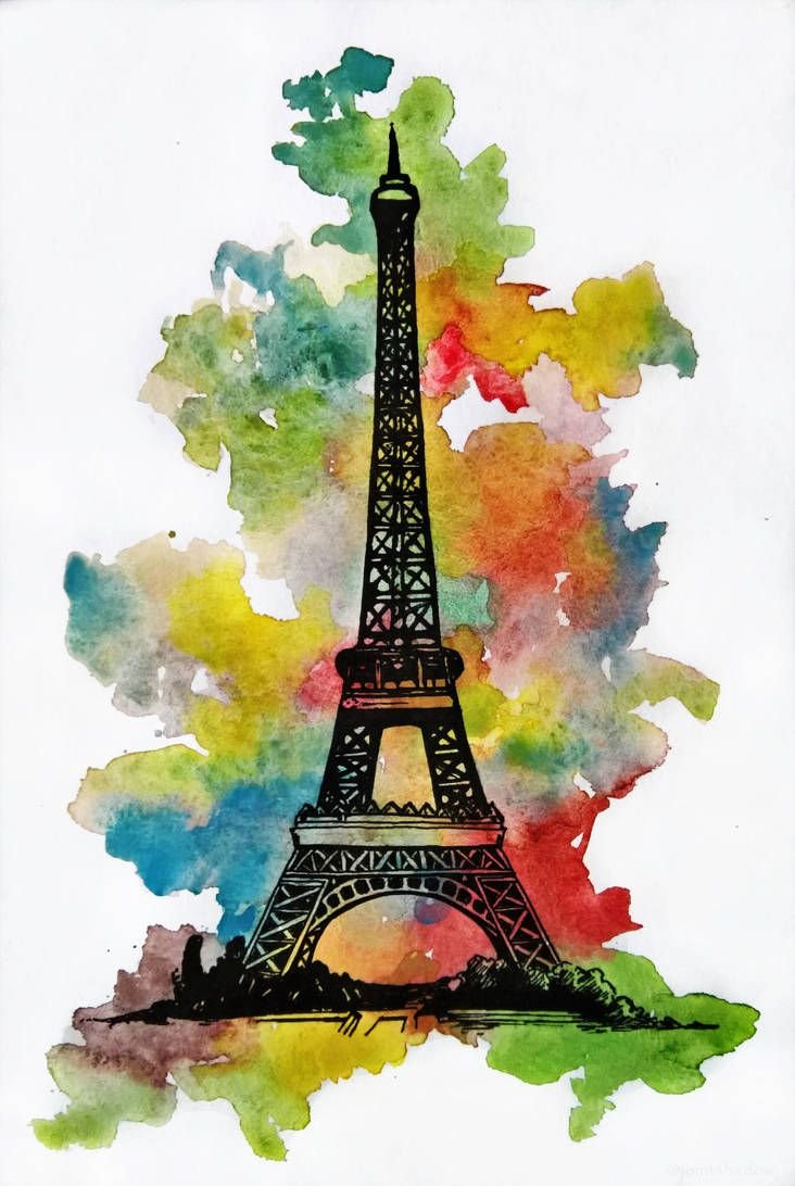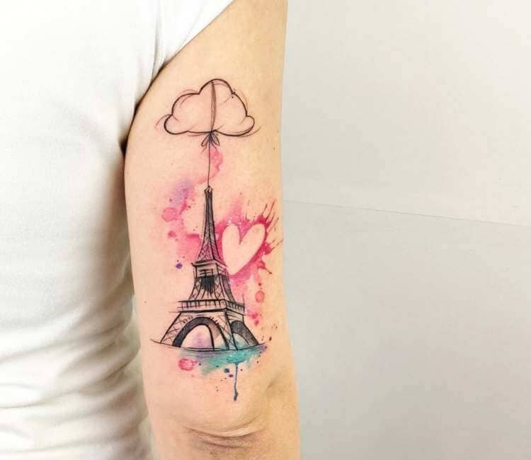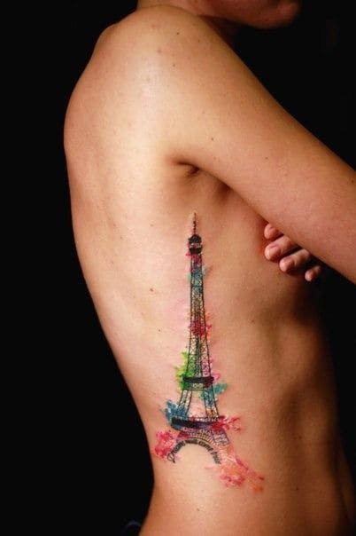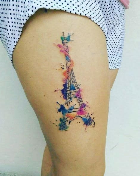 • Для романтичных натур отличным стилем для татуировки эйфелевой башни является акварель. Тату в акварельном стиле смотрится будто рисунок изобразили при помощи акварельных красок, частым дополнением служат множество разноцветных брызг и потеков, которые придает изображения воздушности.