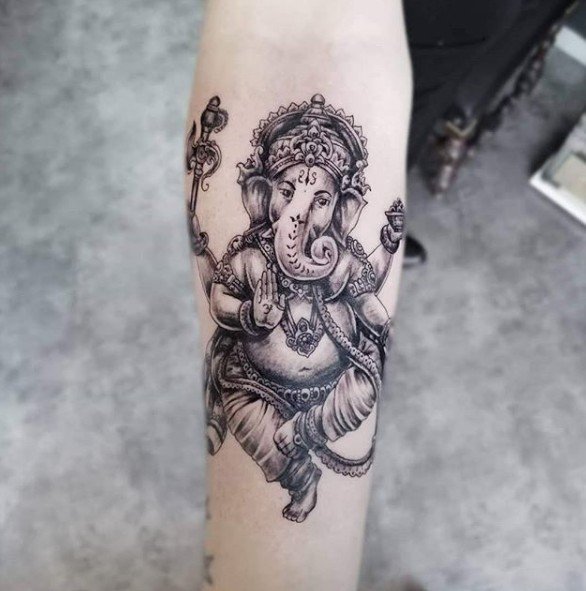 Тату Ганеши наносят на руку, запястье, на ногу, спину, живот или плече.
