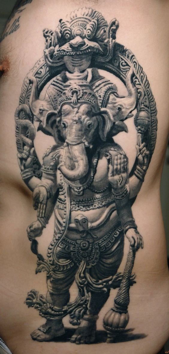 Не удивительно, ведь данные изображения несут в себе особую энергетику, а так же выступают для человека в роли оберега, талисмана. Еще символика индийской религии обозначает что обладатель тату ведет непрерывную работу над самим собой. В основном в тату индийского направления встречаются изображения богов, один из самых известных и почитаемых богов является Ганеша, про обозначение которого и пойдет речь в данной статье. Ганеша - бог мудрости и благополучия. Изображается божество с человеческим телом (которое имеет большой живот); от двух - до тридцати двух рук; а вместо человеческой головы - голова слона, которая имеет один бивень. Для тех, кто незнаком с данной религией, такое изображение покажется странным, и врядли человек выберет его для тату. А вот монахи, верующие и люди связаны с традициями востока, часто выбирают для тату именно тату-эскиз Ганеши. Какое же обозначение несет в себе тату божества? Давайте рассмотрим.