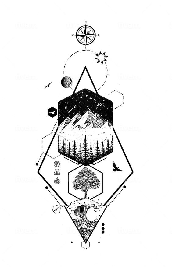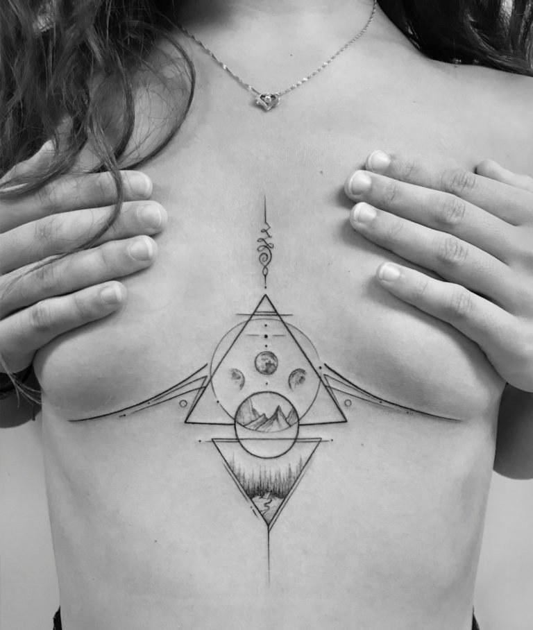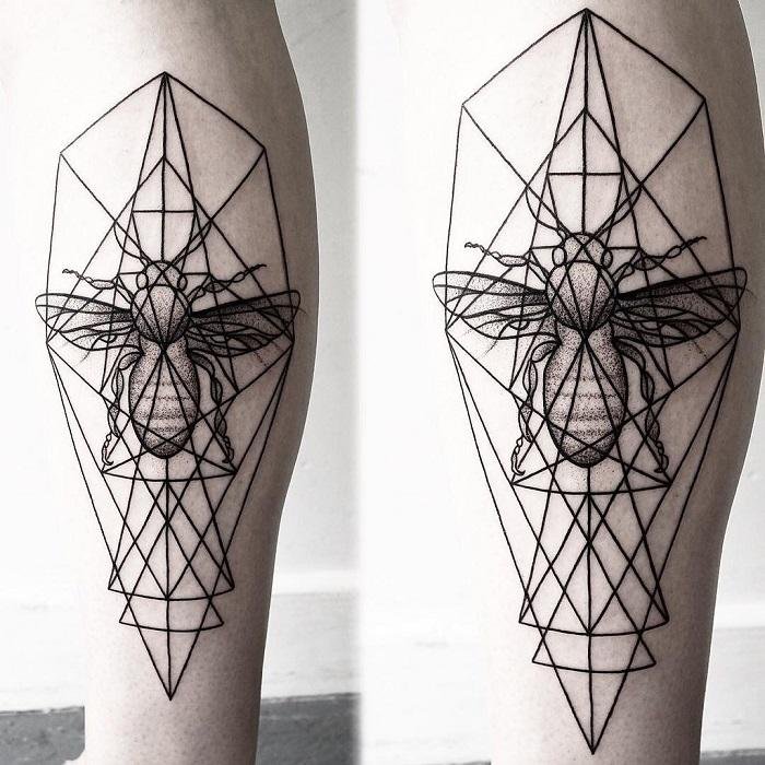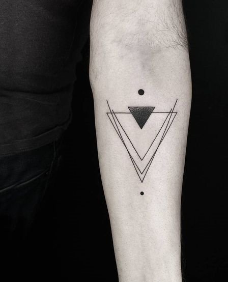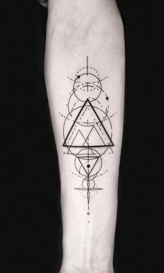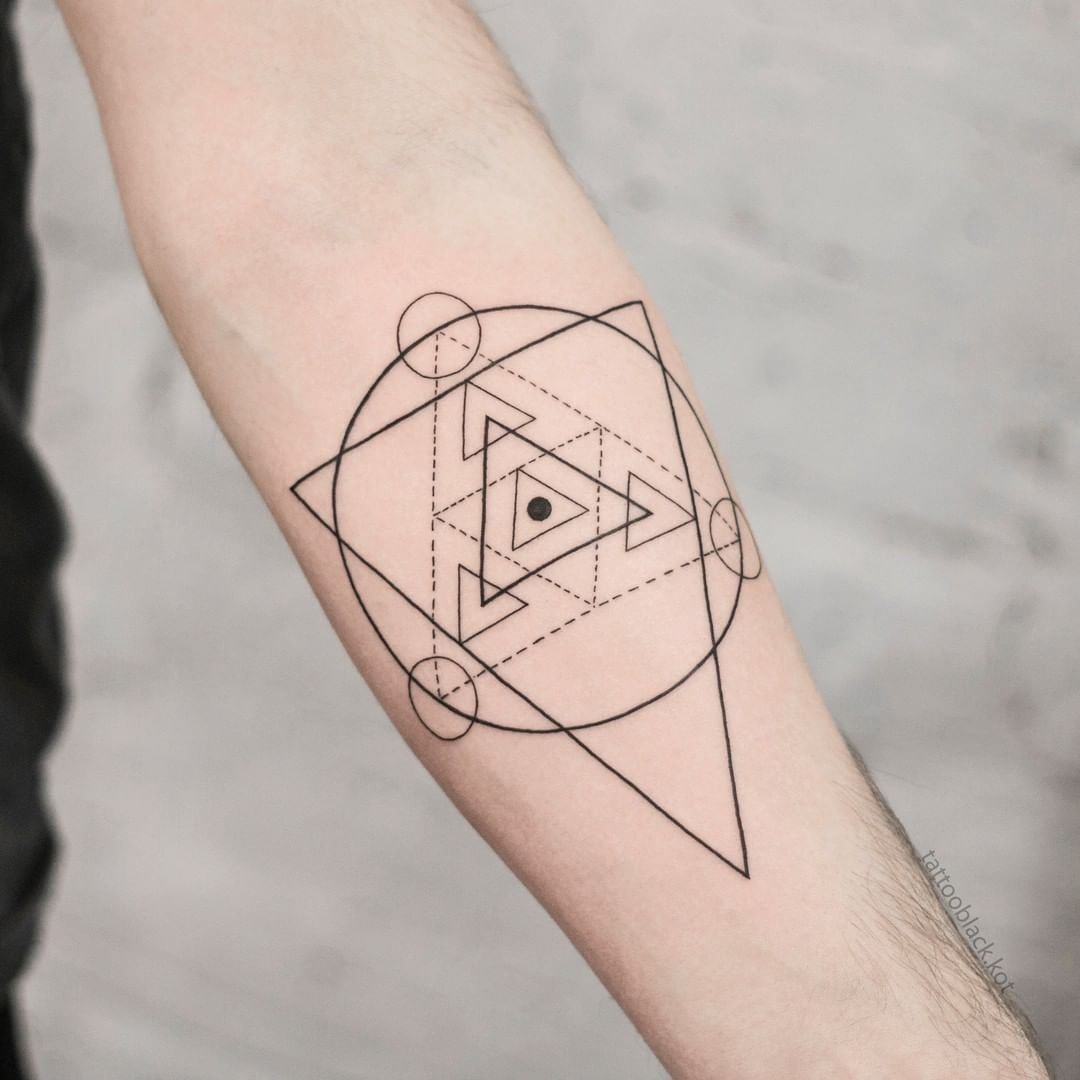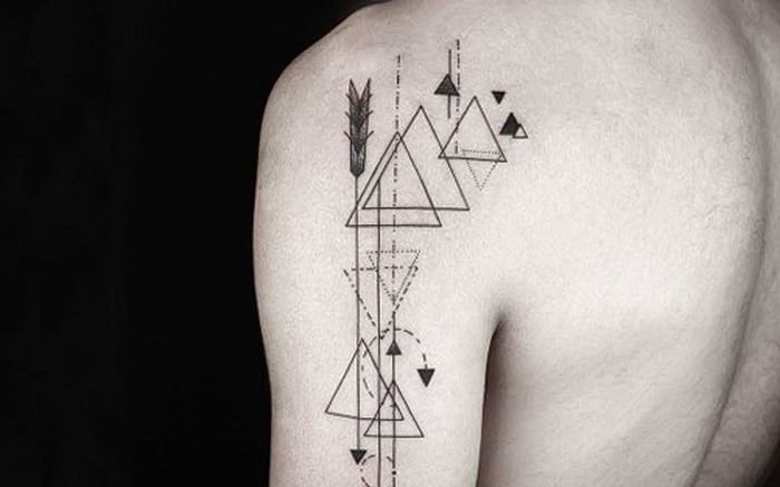 Татуировки в геометрическом стиле являются очень популярными, причем во всем мире, ведь с помощью фантазийного переплетения линий, собирается уникальный рисунок, наделен смыслом и необычным сюжетом. Стоит заметить, что символика многих тайных обществ содержит в себе геометрические фигуры, поэтому многие связывают геометрические изображения с чем-то таинственным, сакральным. Именно из-за скрытого смыслового характера, многих и привлекают геометрические изображения. К тому же такие работы всегда очень привлекательны, неординарны и очень оригинальны. Часто в татуировках встречается изображение треугольника, который имеет смысловую трактовку семьи, обеспеченности и жизненного равновесия, а так же пламя, огня и математическое число - 3.