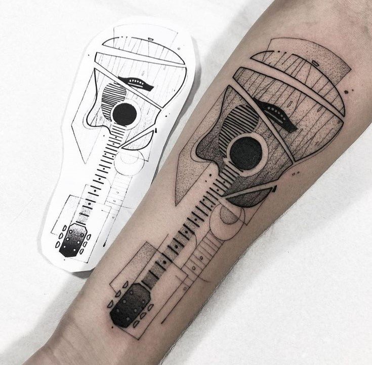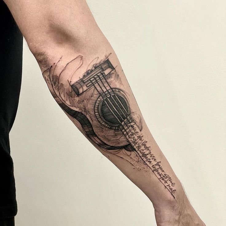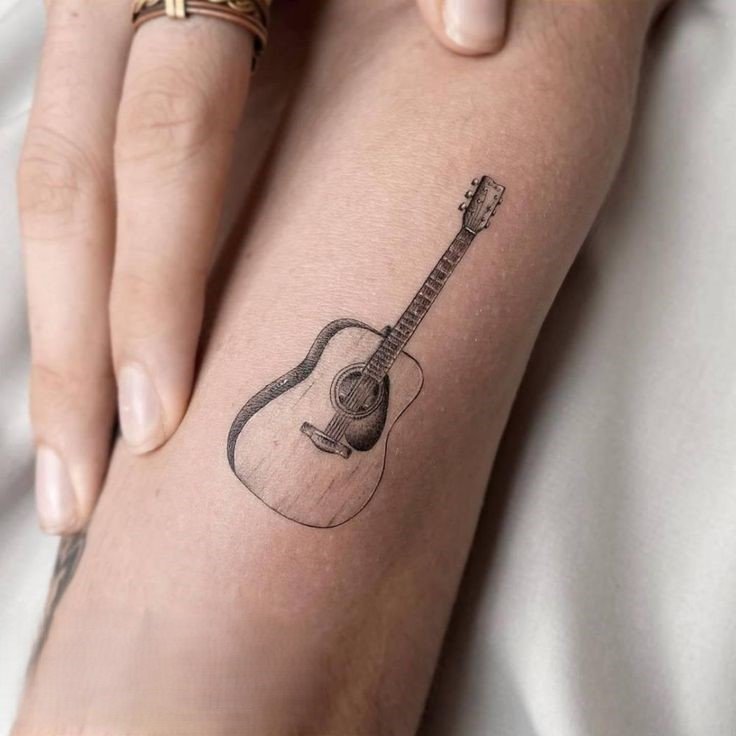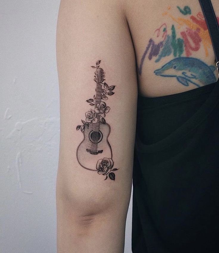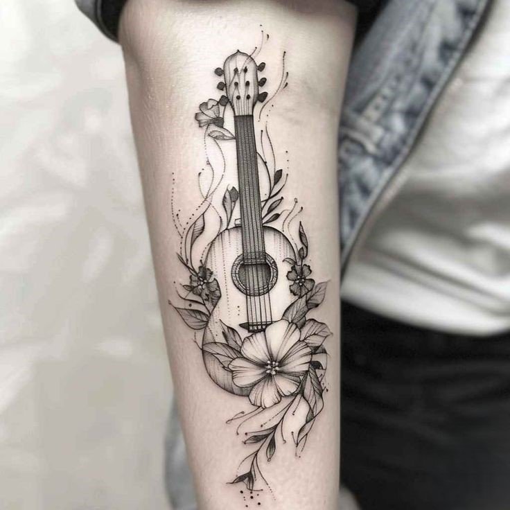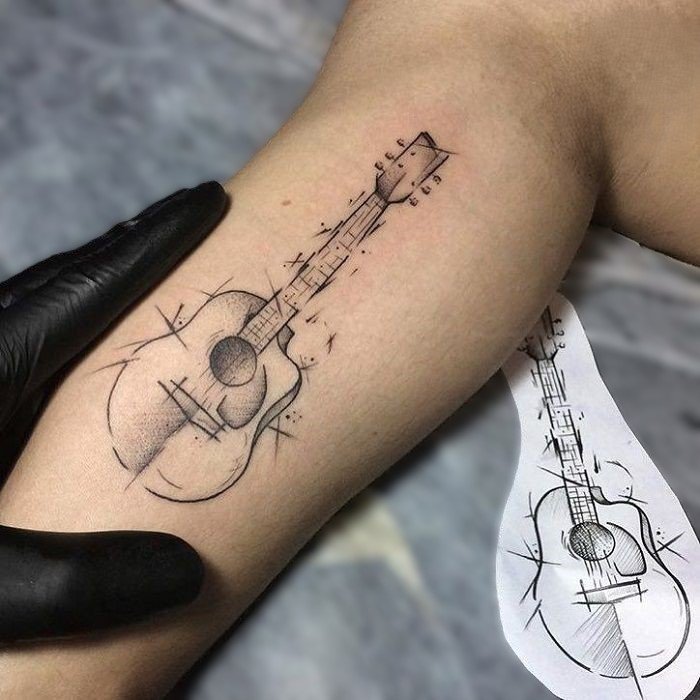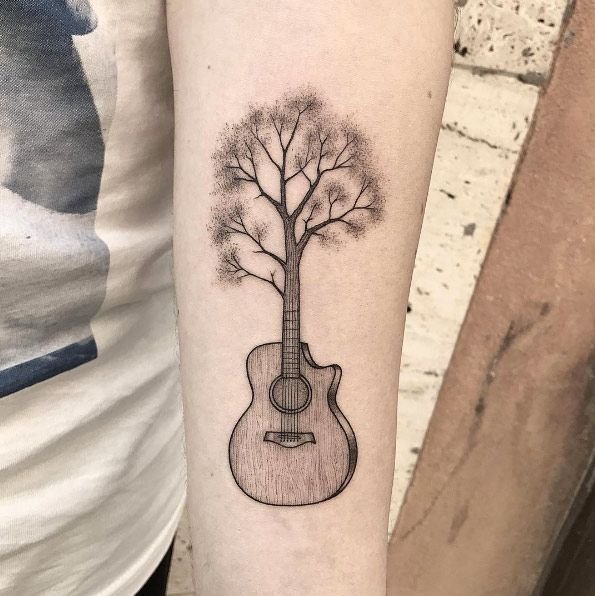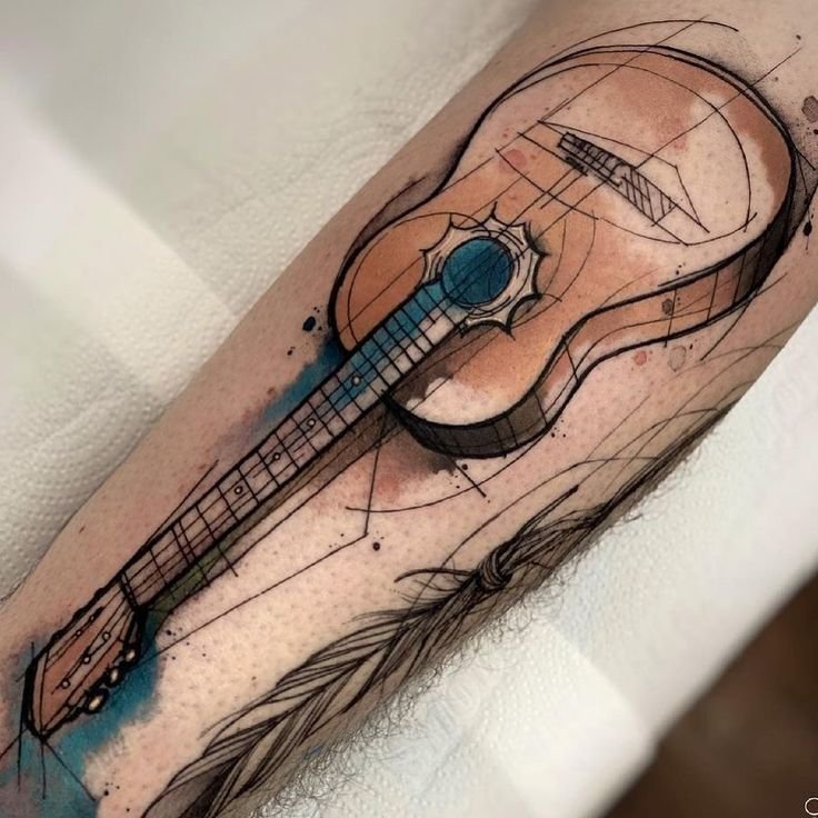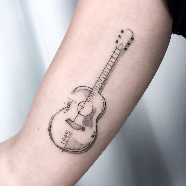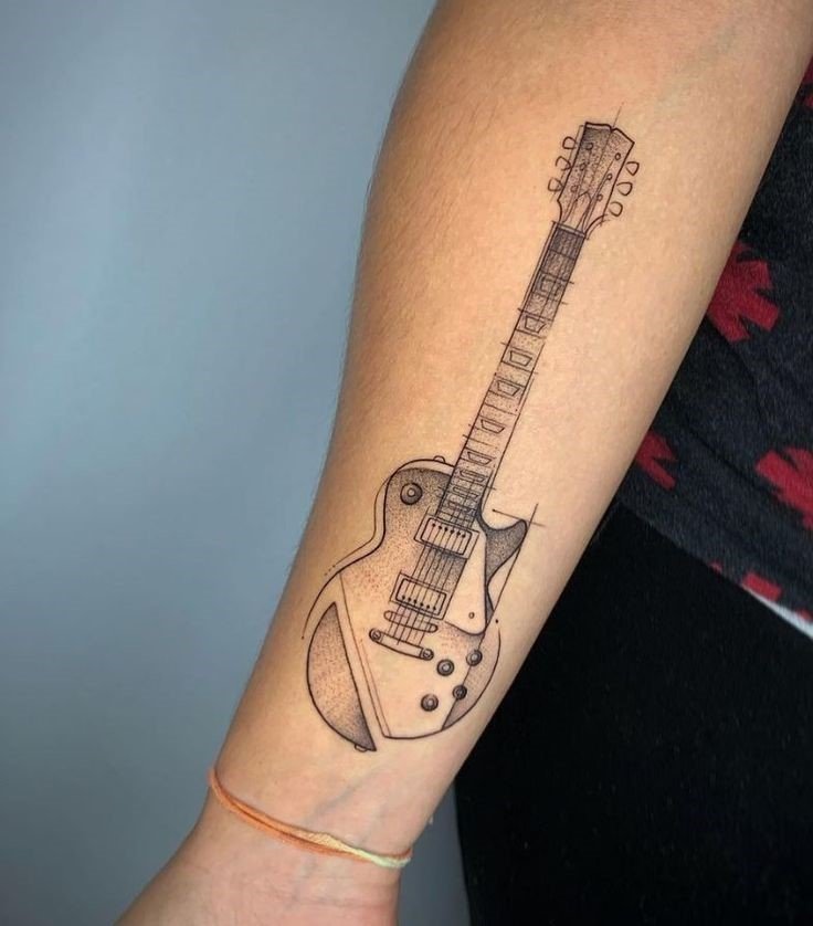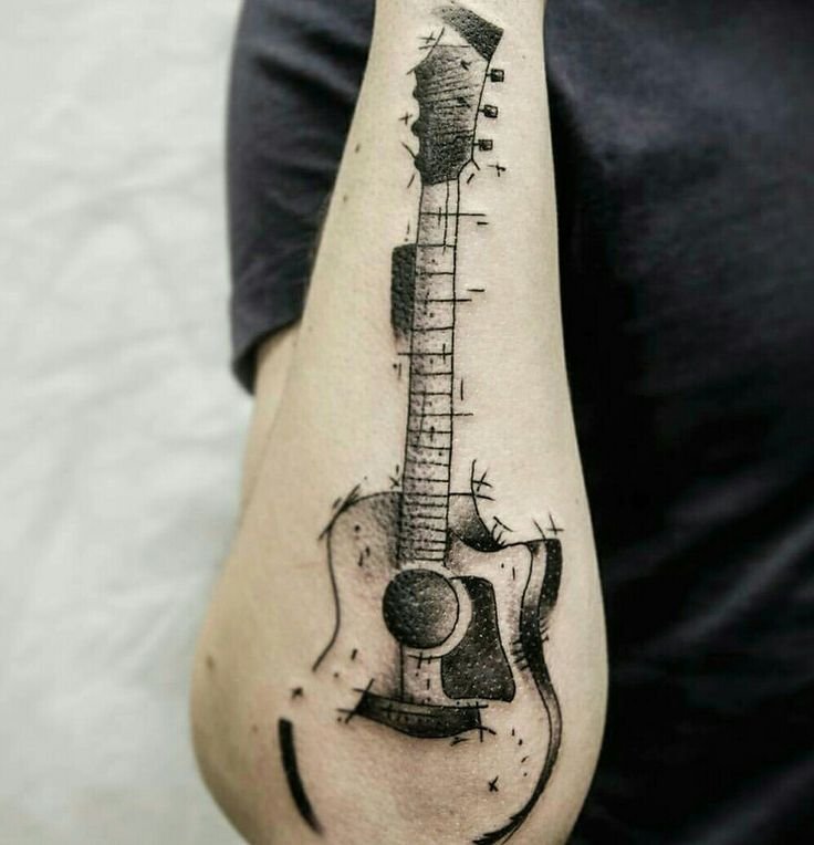 Множество лет татуировки удивляют людей своим количеством и разнообразием стиля, каждый может выбрать эскиз по душе. Очень популярными татуировками являются изображения музыкальных инструментов, а в особенности гитары. Часто данная татуировка встречается на руках, плечах или на груди у музыкантов. Крайне редко можно увидеть гитару изображенную на ноге.