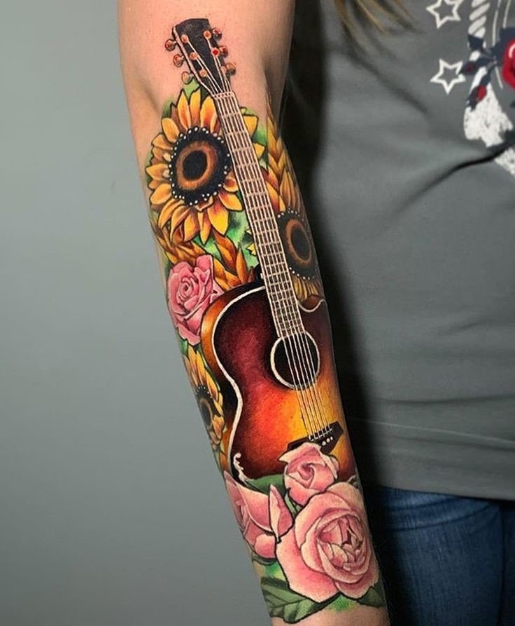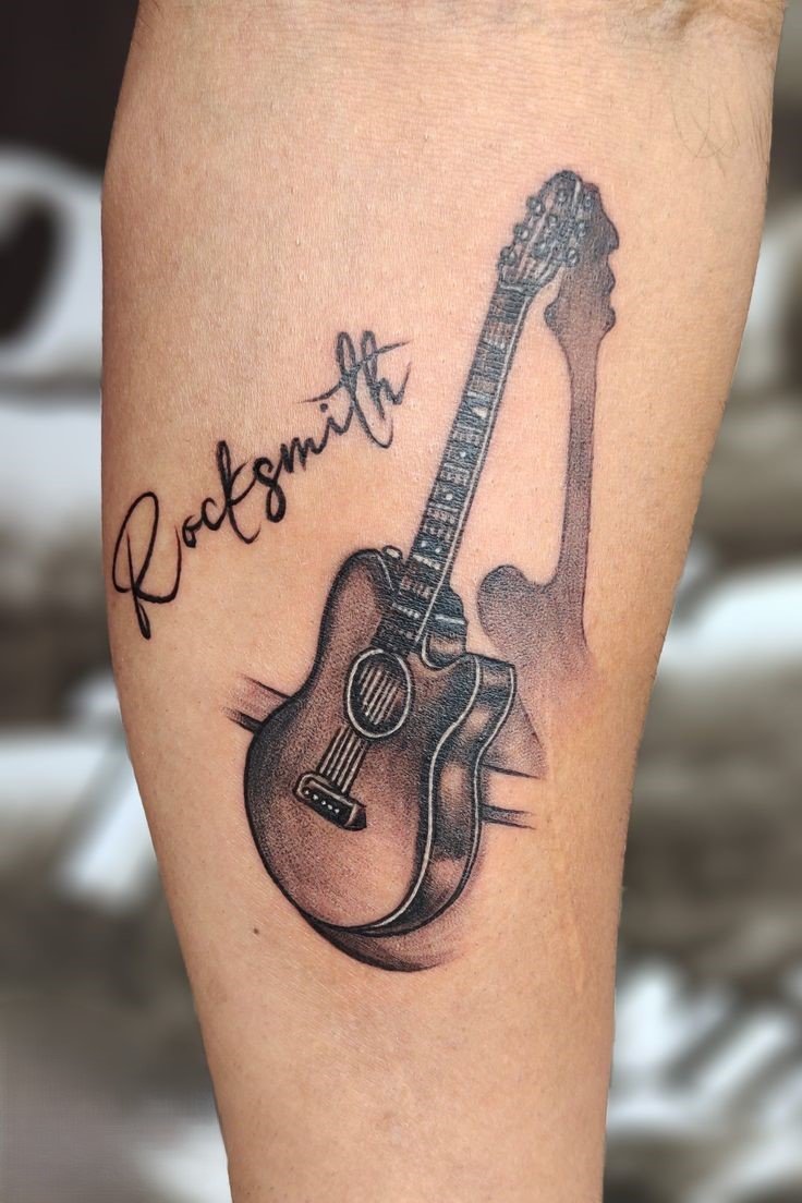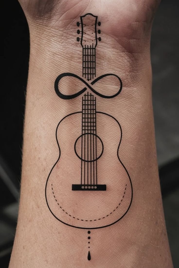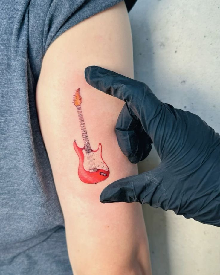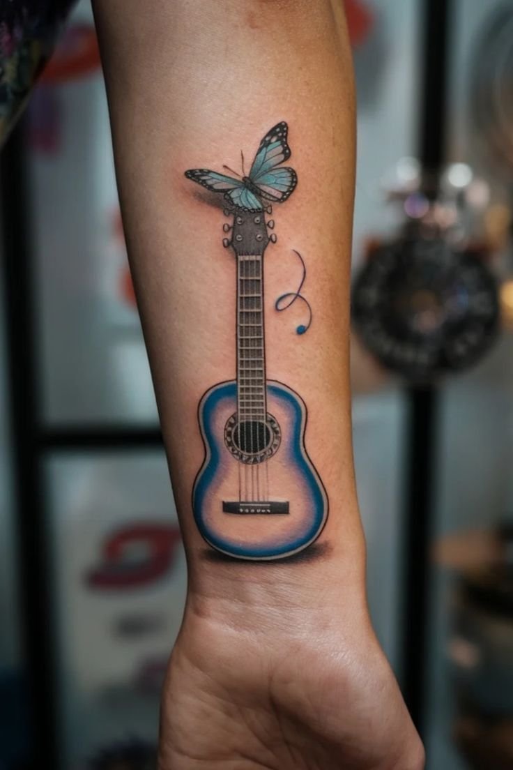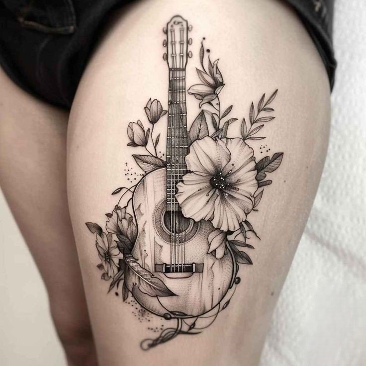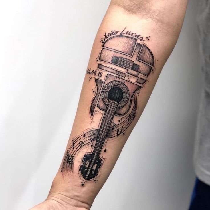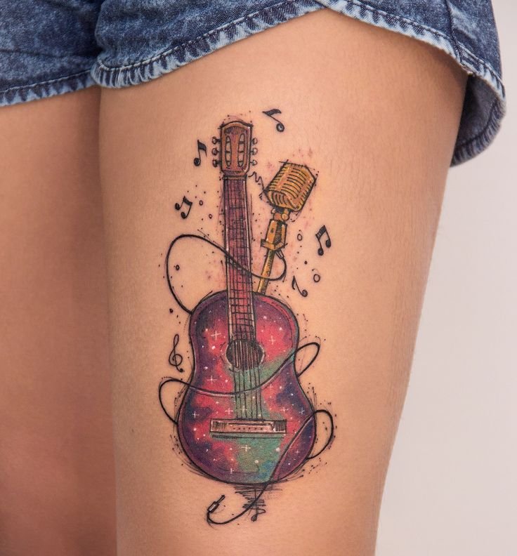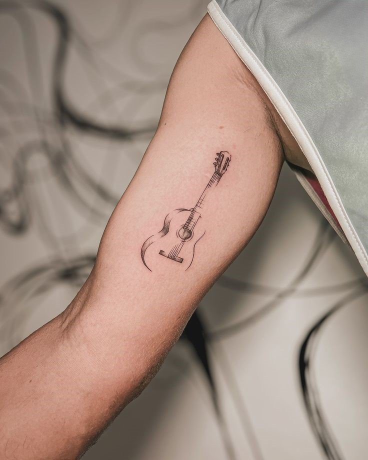 Множество лет татуировки удивляют людей своим количеством и разнообразием стиля, каждый может выбрать эскиз по душе. Очень популярными татуировками являются изображения музыкальных инструментов, а в особенности гитары. Часто данная татуировка встречается на руках, плечах или на груди у музыкантов. Крайне редко можно увидеть гитару изображенную на ноге.