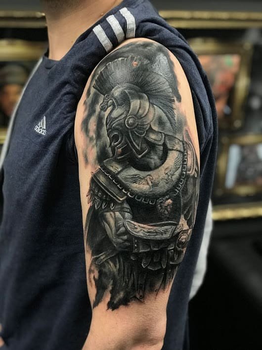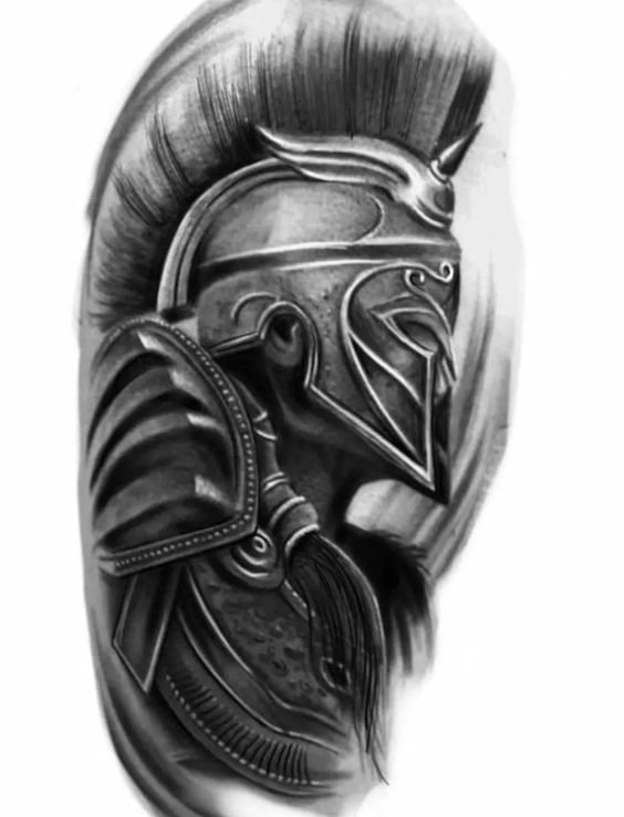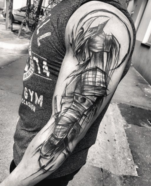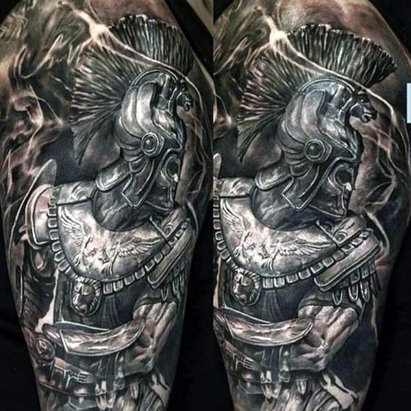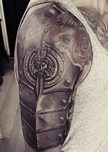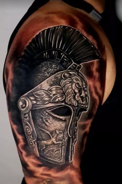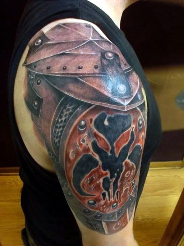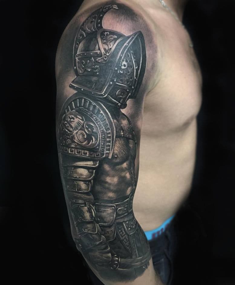 Довольно часто для татуировки выбирают не изображение гладиатора, а его доспехов: латы, шлем, орудие для боя.
