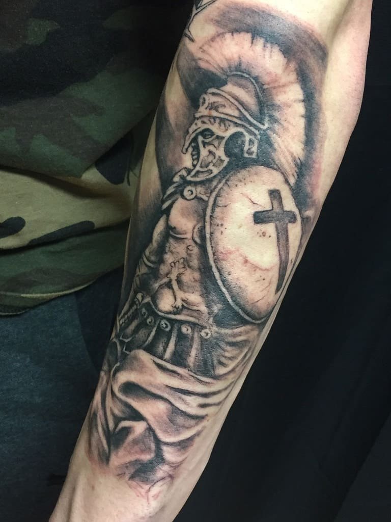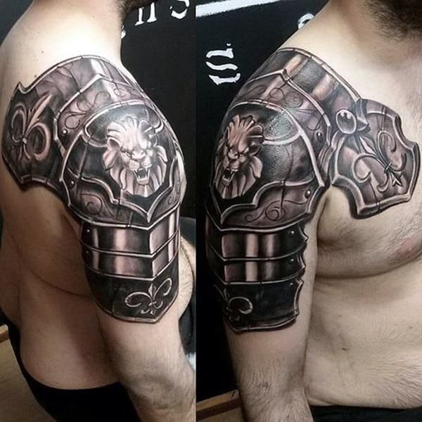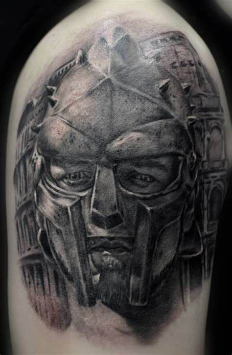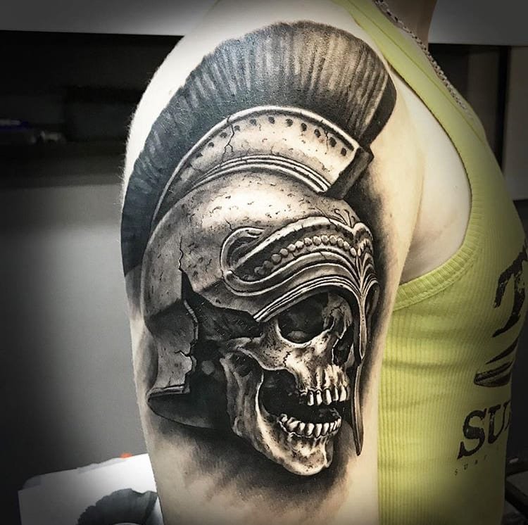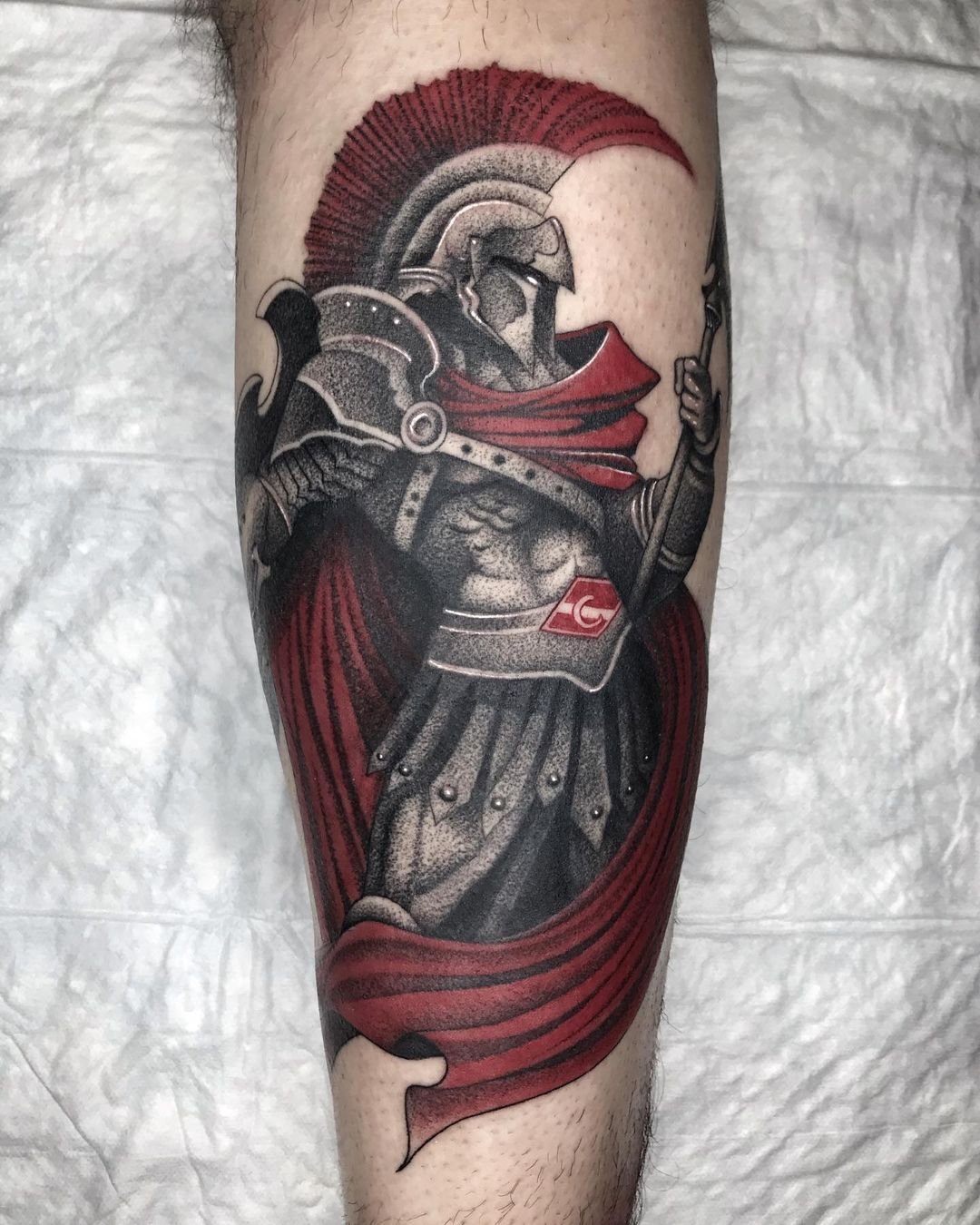 Довольно часто для татуировки выбирают не изображение гладиатора, а его доспехов: латы, шлем, орудие для боя.