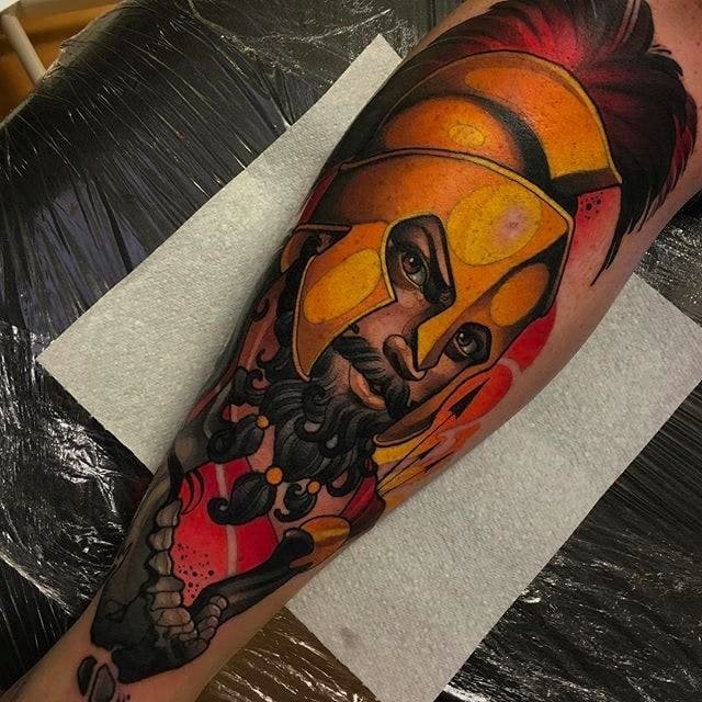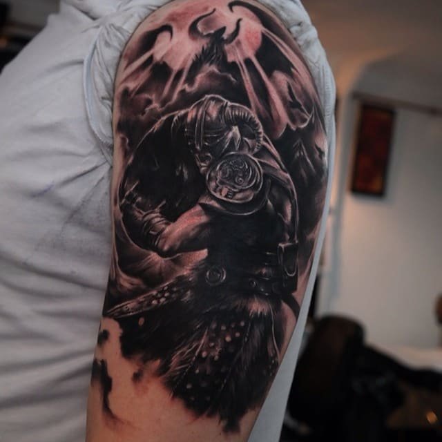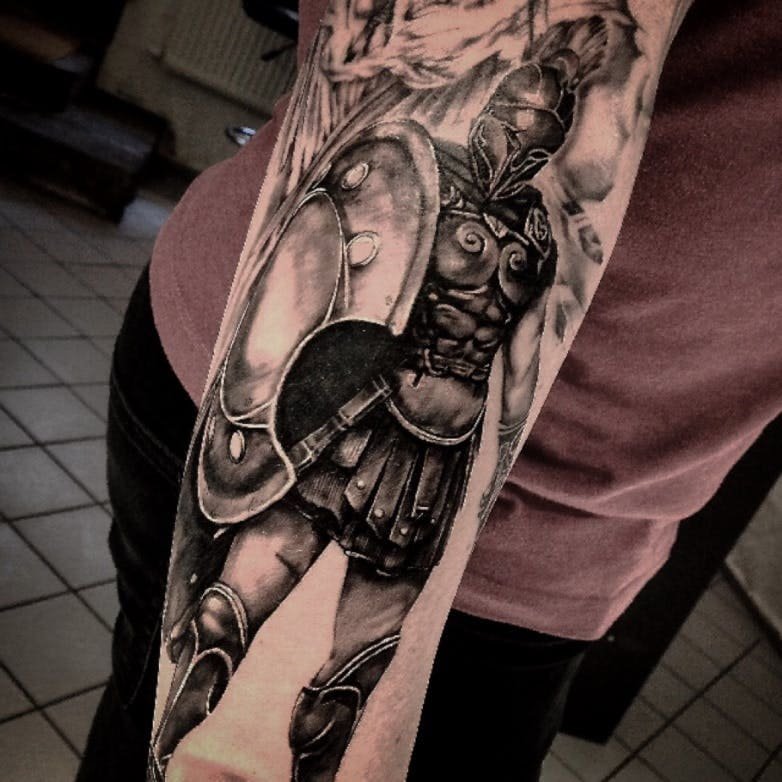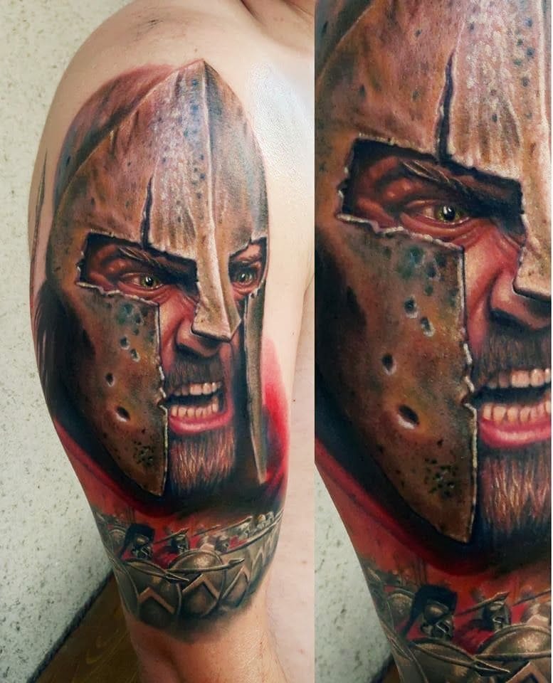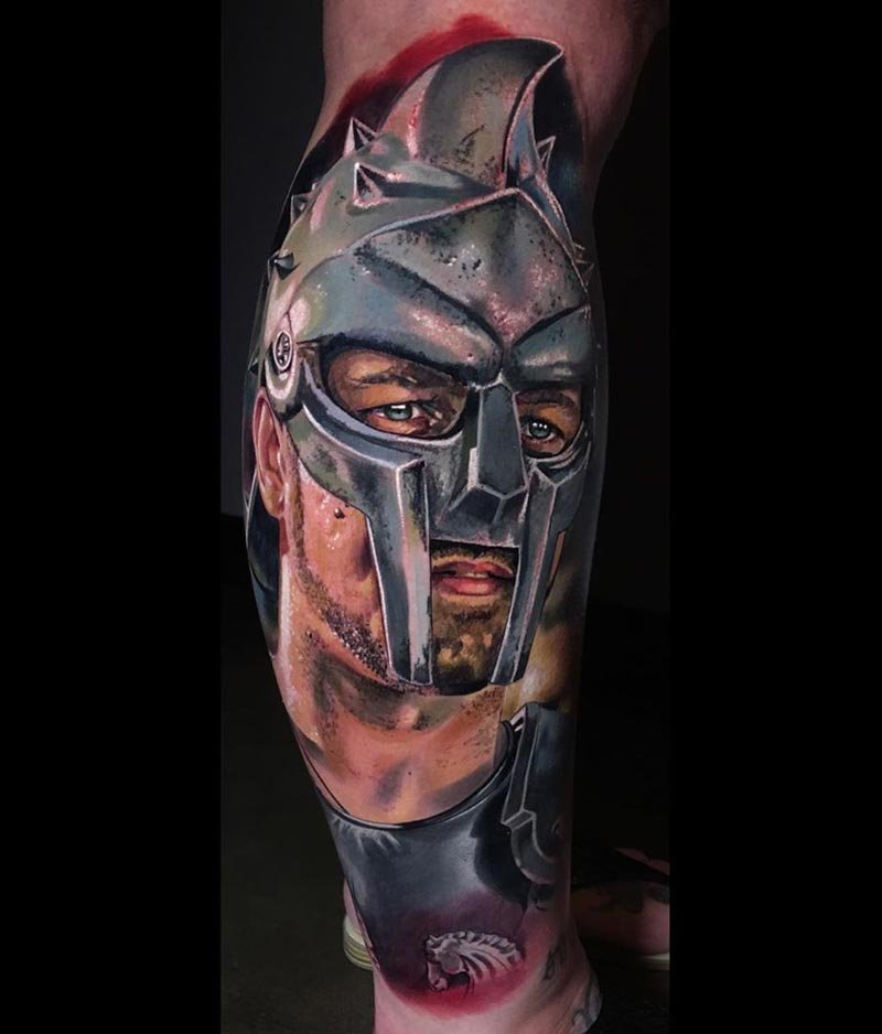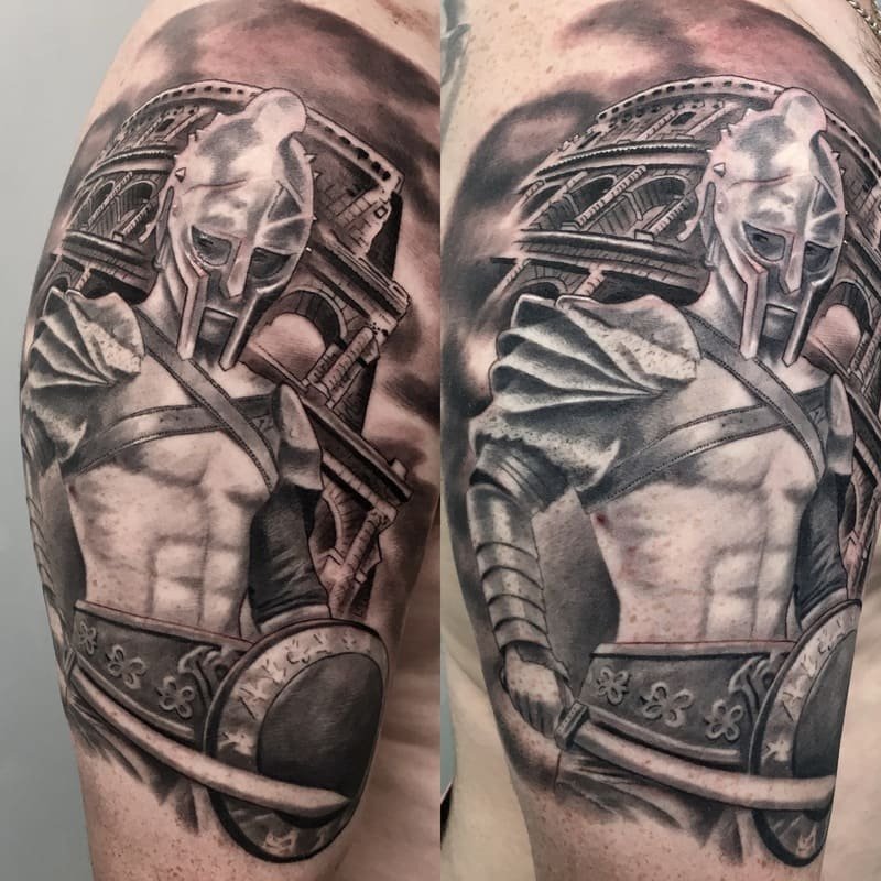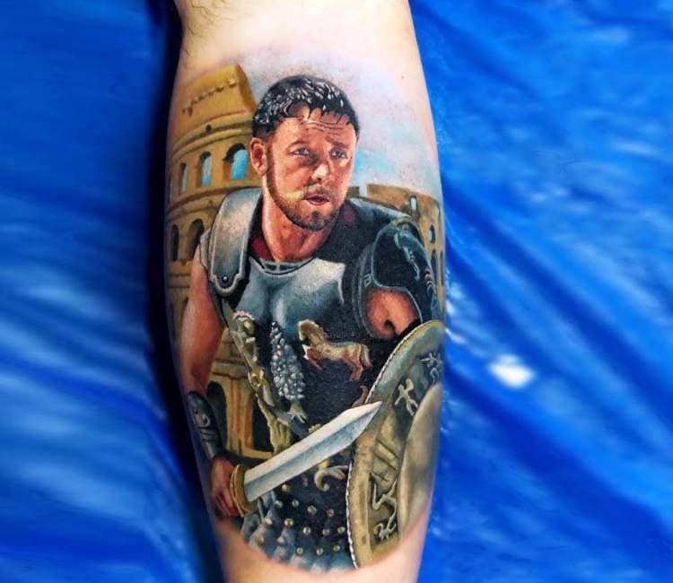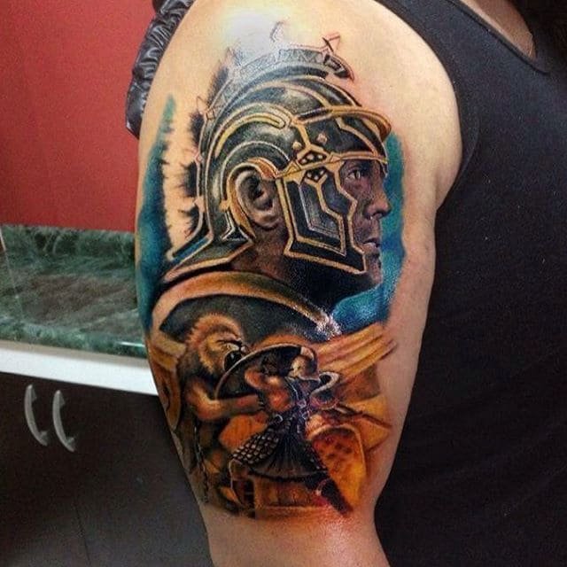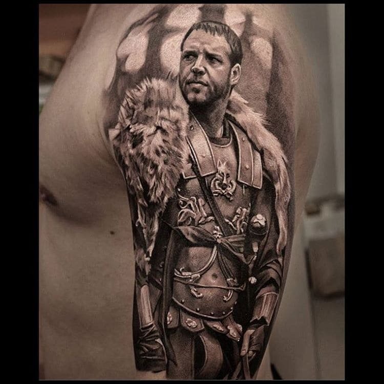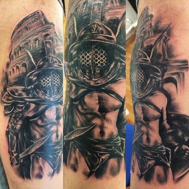 Для татуировки с гладиатором, обычно выбирают известных героев - Максимуса из известного фильма "Гладиатор", либо Ахилла из кинофильма "Троя". Так же, часто можно встретить изображения гладиаторов из сериала "Спартак".