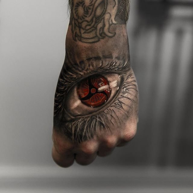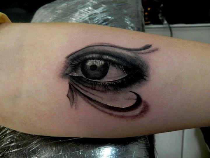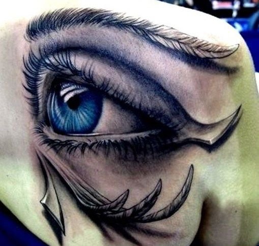 - Во времена Древнего Египта было принято наносить на свое тело глаза богов, которые служили для людей в качестве оберега. Изображение глаза бога Ра дает человеку великую силу справляться с самыми разными трудностями, которые ему предоставляет жизнь. Так же глаз бога Ра дарует человеку состояние покоя, возможность исцелится от множества недугов. Еще данное изображение является олицетворением радости и света. Египтяне так же верили в большую силу изображения глаза бога Гора, данной изображение служит для человека как мощный оберег, люди верили что с его помощью можно увидеть что скрывается в человеческих душах. Глаз Гора в основном изображается на фоне пирамиды либо в треугольнике, кроме связи с богом данное изображение так же было известно как знак сообщества масонов. У них это изображение служит официальной эмблемой их тайного ложе, татуировка на теле человека может говорит о том что он входит в данное сообщество.