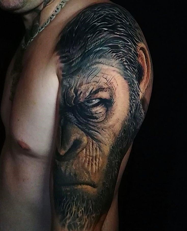 Но, как правило, самым основным обозначением татуировки гориллы являются такие качества как мощность, невероятная сила, чувство власти и стремление к победе. Данное обозначение не зависит от стиля исполнения изображения и дополнительных элементов.