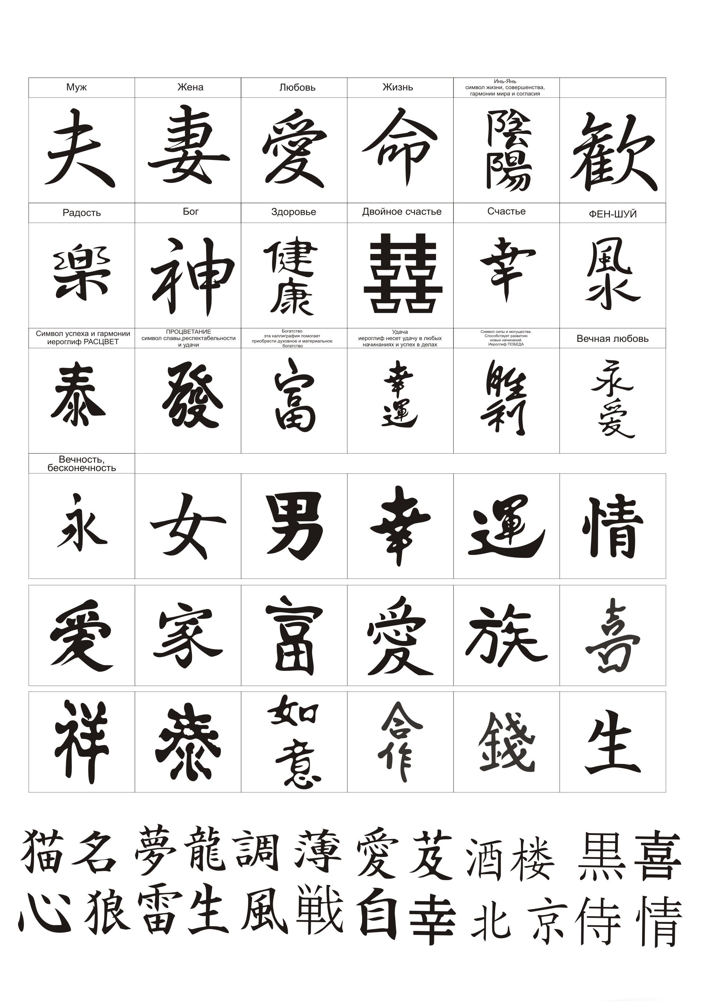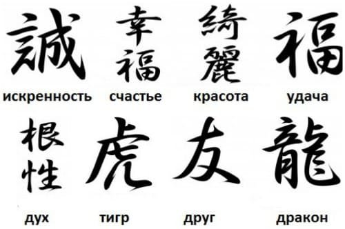 Символы китайского, японского алфавитов привлекают своей необычной формой, минимализмом, тайным смыслом. Иероглифы можно отнести к татуировкам надписям, однако основное различие заключается в том, что иероглиф не изображается при помощи различных шрифтов. Шрифты подходят лишь для фраз на других языках: английская, русская, арабская надписи.