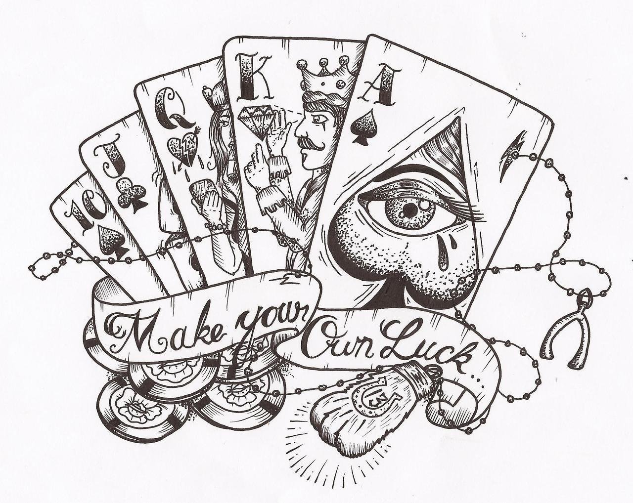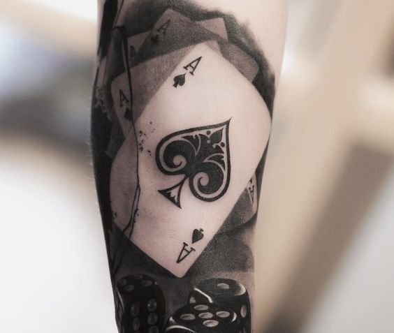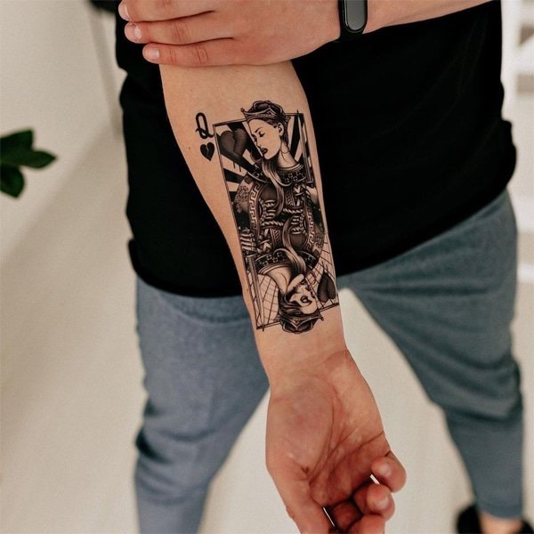 Довольно часто эскиз с игральными картами выбирают азартные люди, считается что изображение карт на теле приносит своему обладателю везение. Это касается не только людей, которые играют в карты, но и бизнесменов, любителей фортуны.