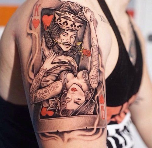 Тату с игральными картами часто выступают в роли парной татуировки для влюбленных. В данном случае у парня на теле присутствует тату с картой короля, а у его второй половины - тату с дамой. Как правило, масть карт в данном варианте - черва.
