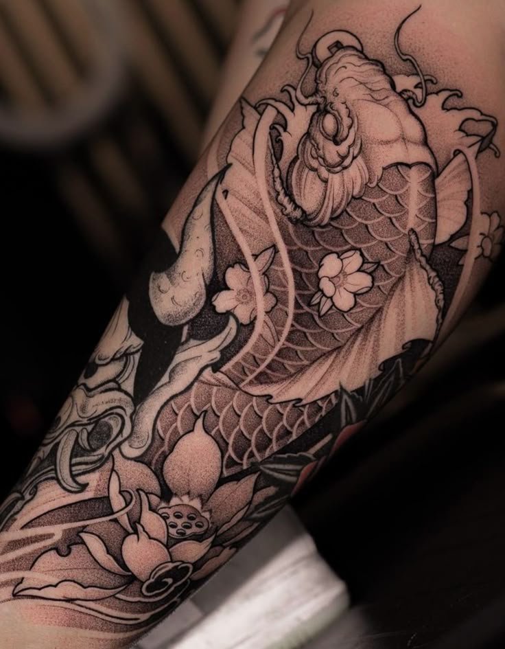 Татуировка с изображением карпа кои – это образ, который несет в себе глубокий смысл, соединяя элементы природы и философии.